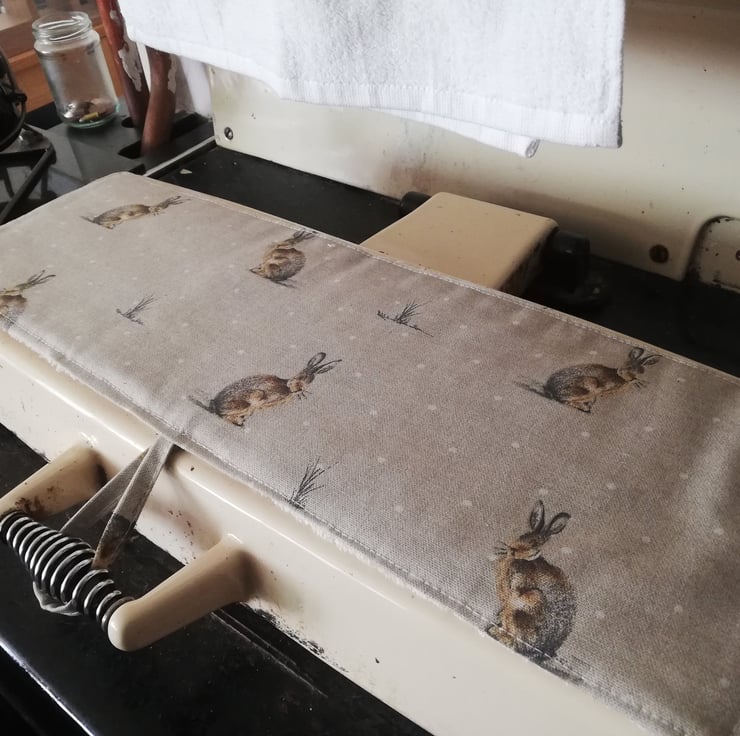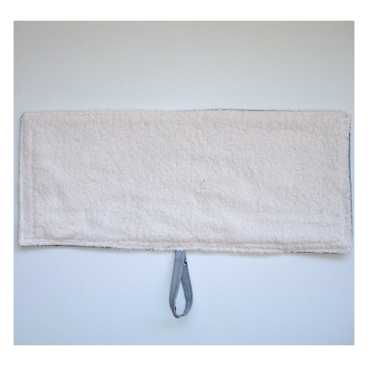 This mat has a handy fastening loop which keeps it in place when you lift the hob cover and has three layers - Facing cotton fabric, a layer of padding and a layer of towelling - Making it also suitable for mopping up and pot-grabbing!
