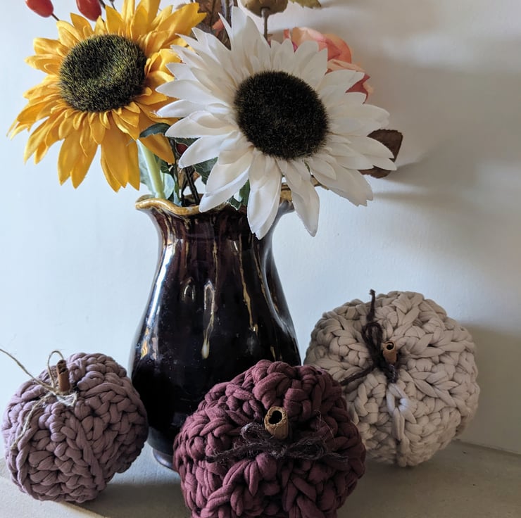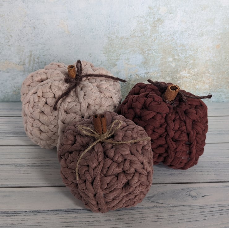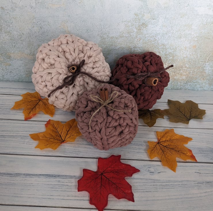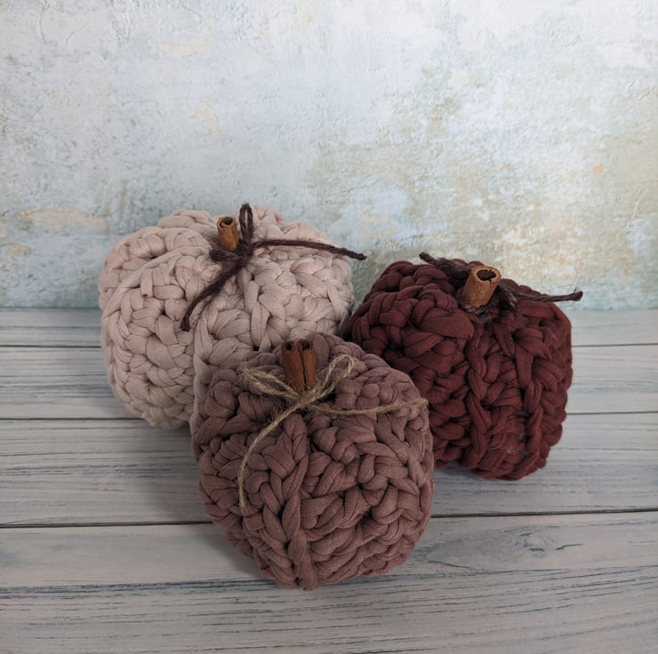They have been crocheted in high quality recycled T shirt yarn, lightly stuffed with polyester filling and finished off with cinnamon stick stalks and jute / string bows. The largest pumpkin is approximately 10cm in diameter and 8 cm in height. The smaller pumpkins are approximately 9cm wide / 7cm tall and 8cm wide / 7cm tall. Due to their handmade nature, each set will be similar to the photographs, but no two sets will be exactly alike.
