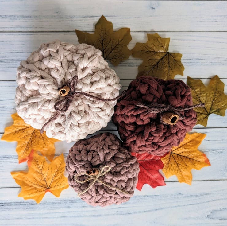 Set of three crocheted pumpkins in complementary shades of shiny beige, deep taupe and a rich reddish brown that will look lovely on display in your home throughout Autumn and into the Winter.