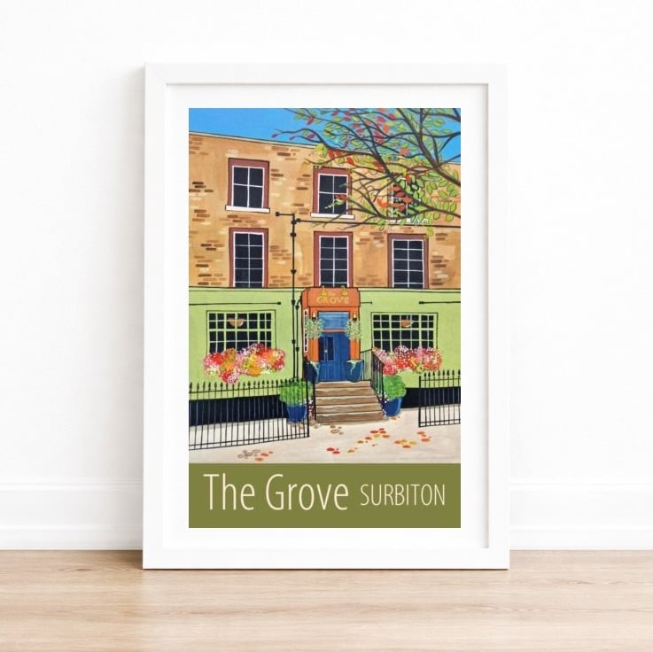 A contemporary travel poster print of The Grove pub in Surbiton, from my own original acrylic painting. A perfect gift for those who love the Grove!