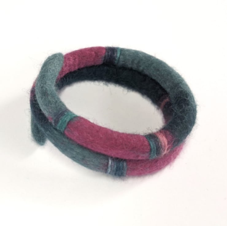 Handmade wet felted bracelet of soft merino wool in shades of duck egg, dark teal and deep pink/magenta, with toning highlights of lustrous merino and silk blend yarn. A flexible wire core allows you to adjust the size easily - just slip it onto your wrist and gently shape it for a perfect fit!
