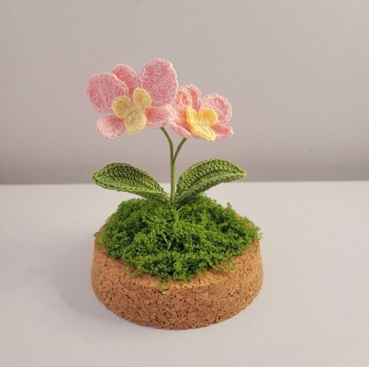 Celebrate the timeless beauty of orchids with this handcrafted crochet arrangement, delicately displayed under a clear glass dome with a natural cork base. Featuring two soft pink and golden yellow orchid blooms with lush green leaves, this miniature garden evokes the grace of real orchids while offering the charm of textile artistry. Each stitch is thoughtfully placed to capture the flower’s delicate curves and vibrant spirit.