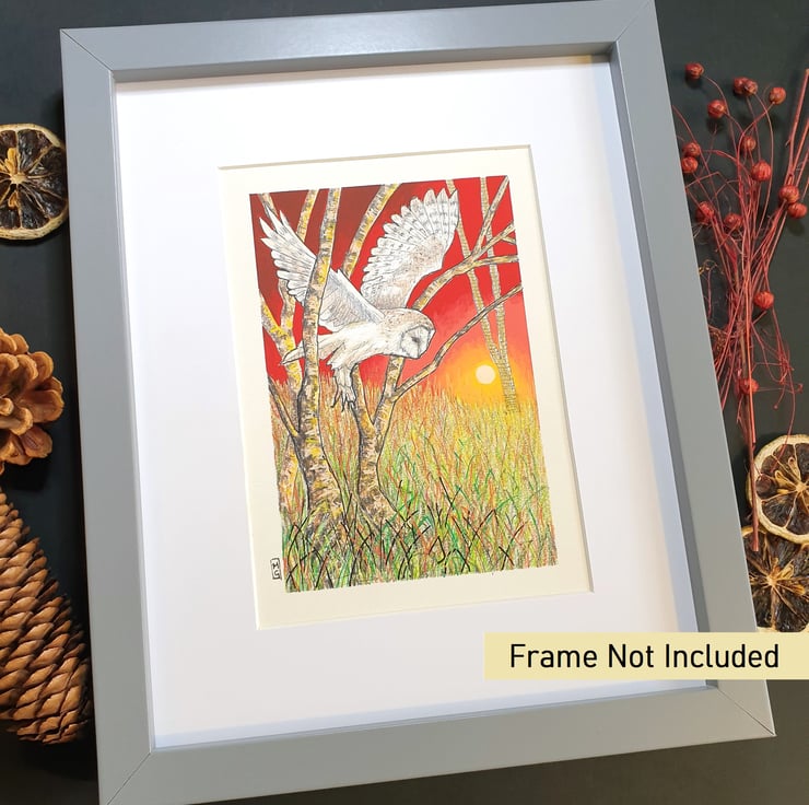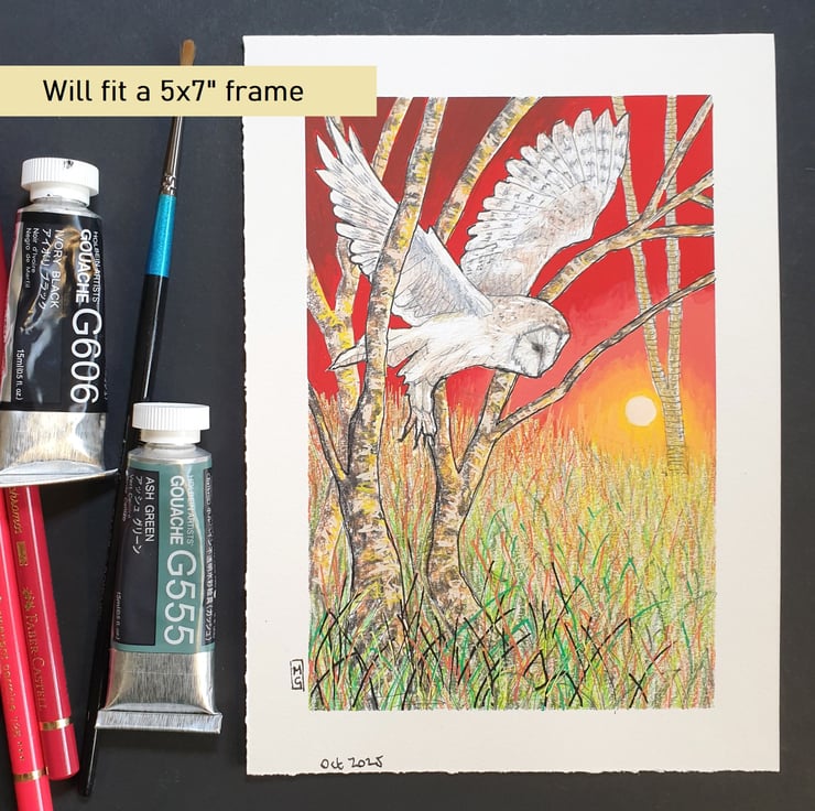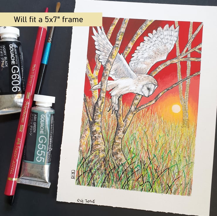 A small colour drawing of a barn owl at sunset, flying through trees, the drawing depicts the owl, grassland and trees with a red sunset sky. The drawing is on white pastel paper.