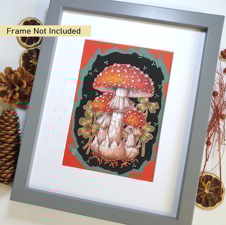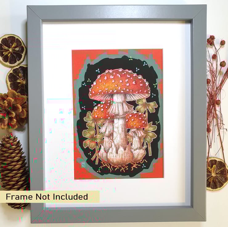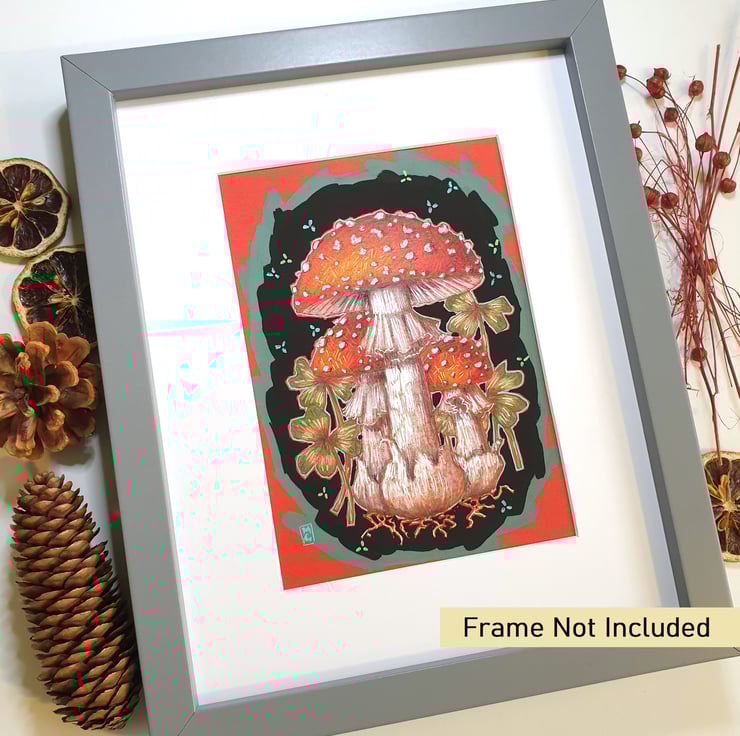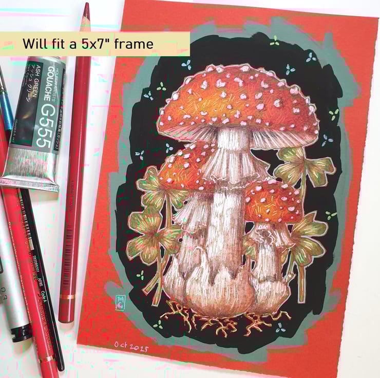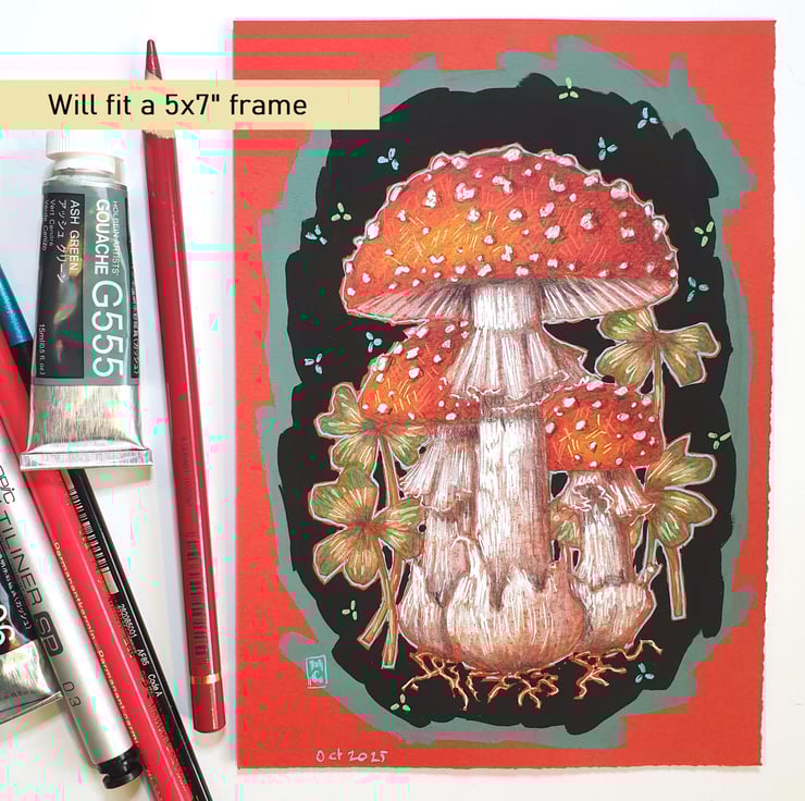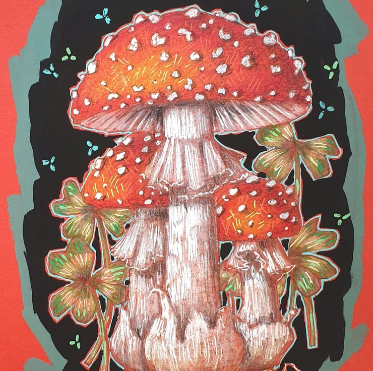 A small fly agaric mushroom illustration on red paper. The drawing depicts these iconic red mushrooms with clover on a black background with a green border.