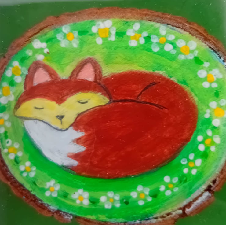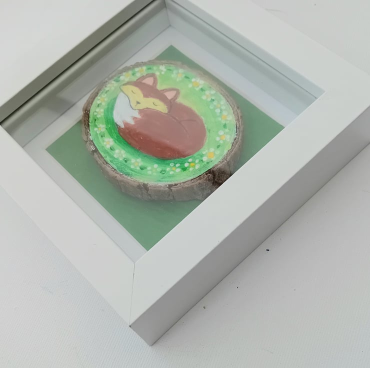 Cute little sleepy fox hand painted on an actual wood slice. In a plastic box frame 12 x 12 x 3 cm. Uk only lovely Christmas gift