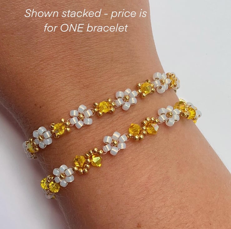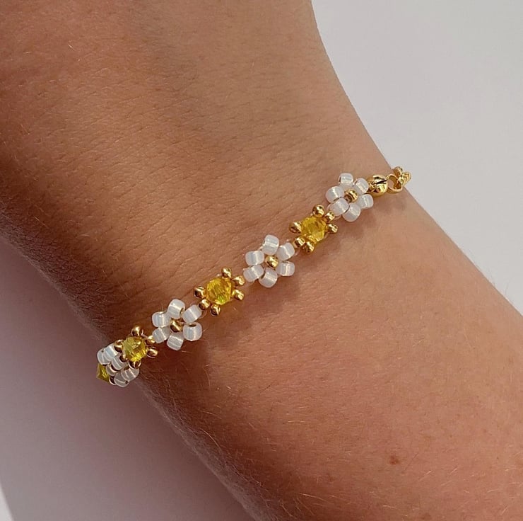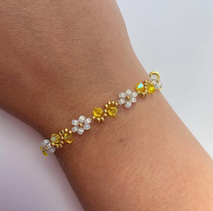 Handmade in my UK studio, this delicate beaded bracelet adds a warm golden sparkle to your wrist. I’ve paired Citrine inspired Preciosa crystals with gilt lined opal daisy beads and duracoat gold seed beads for a gentle shimmer, perfect for November birthdays. Lightweight and comfortable, it layers beautifully or wears well on its own.