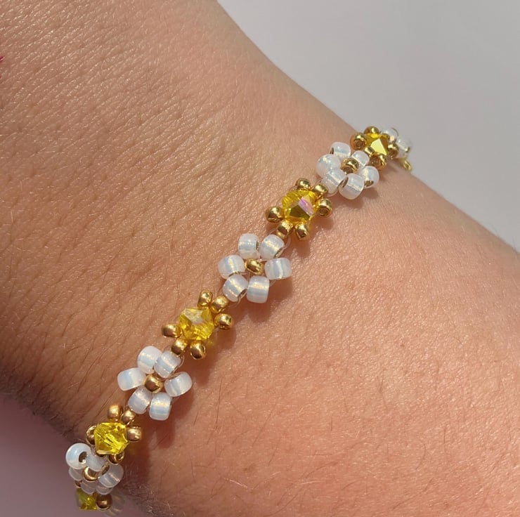 Details - November birthstone inspired, made with Preciosa AB Czech crystals, gilt lined opal daisies, Miyuki duracoat gold seed beads and a 18k gold plated clasp and chain.
