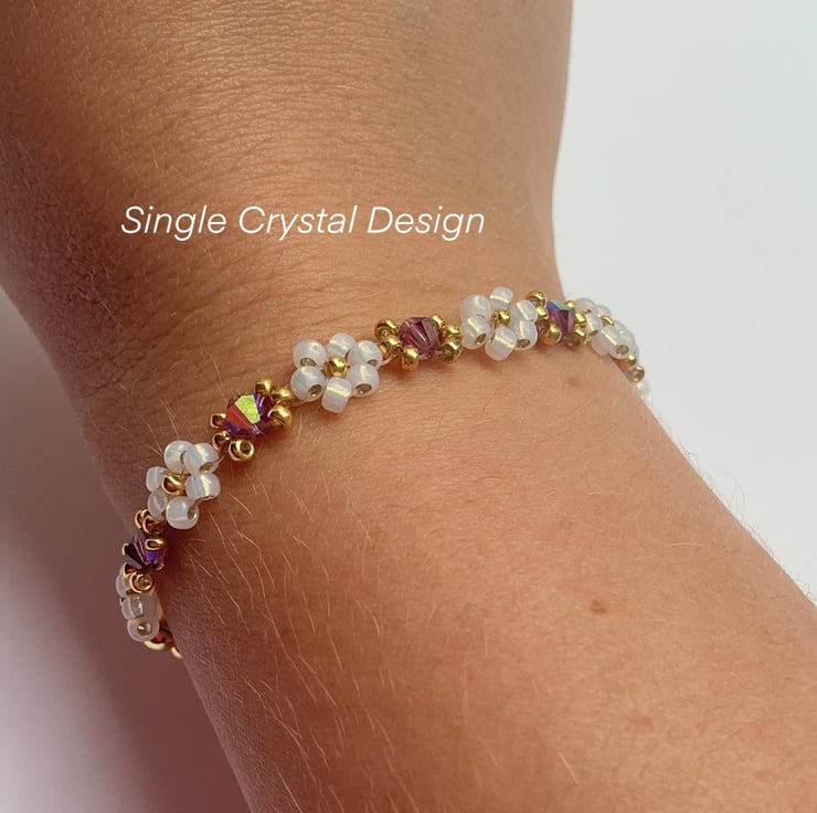 Details - February birthstone inspired, made with Preciosa AB Czech crystals, gilt lined opal daisies, Miyuki duracoat gold seed beads and a 18k gold plated clasp and chain.