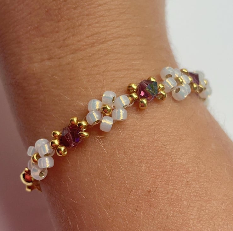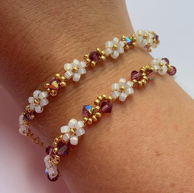 Handmade in my UK studio, this delicate beaded bracelet adds a soft purple sparkle to your wrist. I’ve paired Amethyst inspired Preciosa crystals with gilt lined opal daisy beads and duracoat gold seed beads for a gentle shimmer, perfect for February birthdays. Lightweight and comfortable, it layers beautifully or wears well on its own.