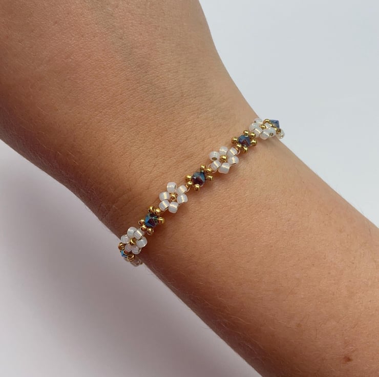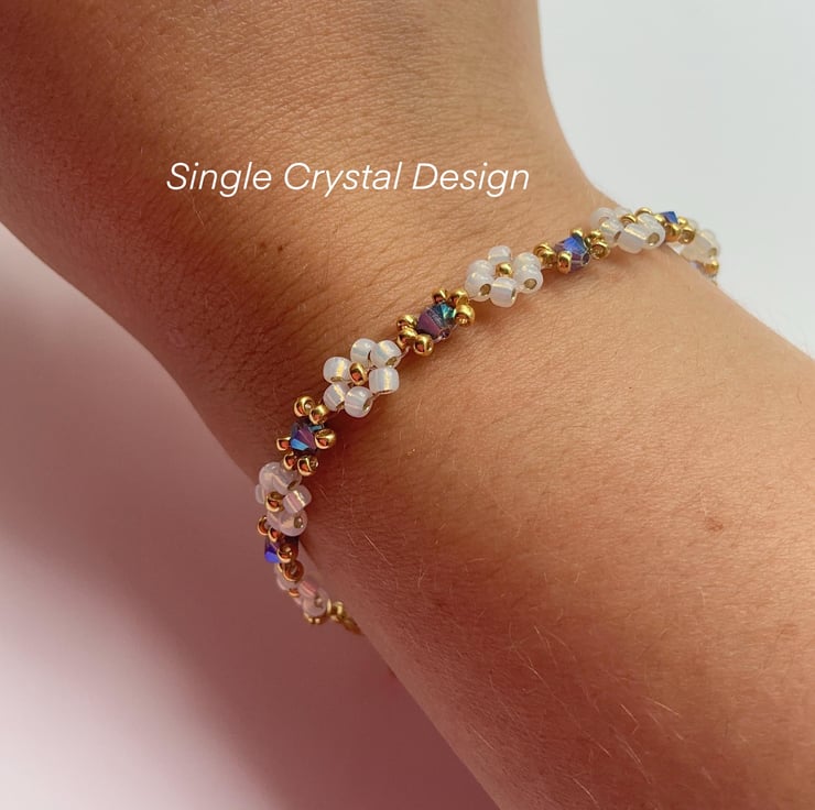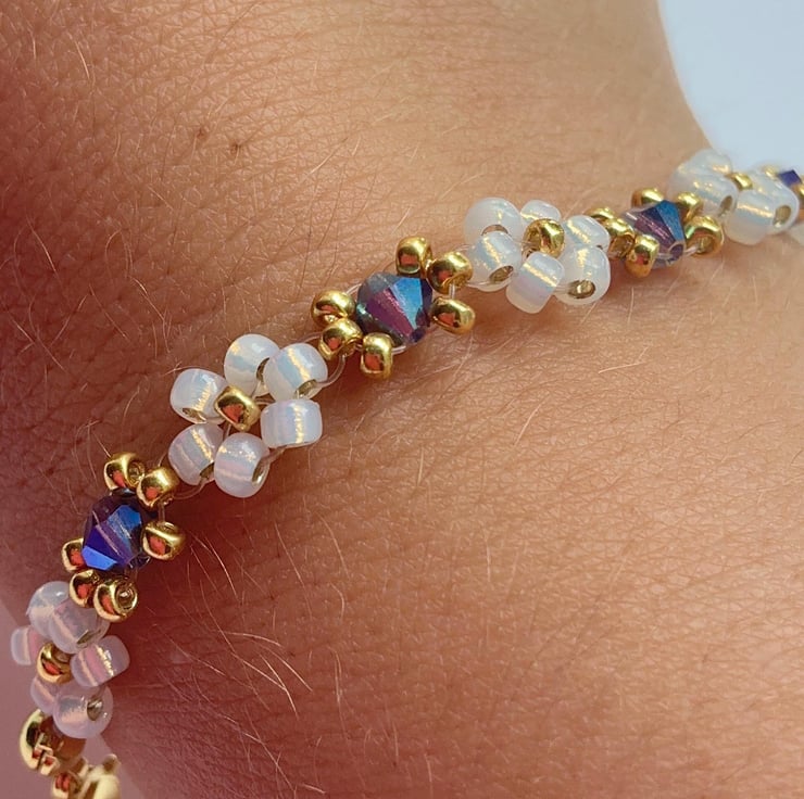 Details - December birthstone inspired, made with Preciosa AB Czech crystals, gilt lined opal daisies, Miyuki duracoat gold seed beads and a 18k gold plated clasp and chain.