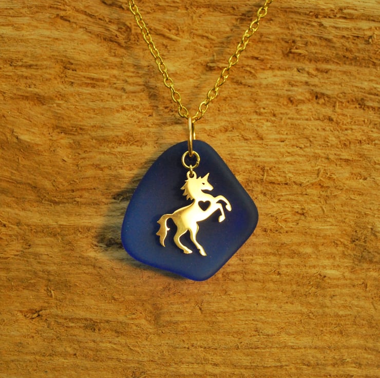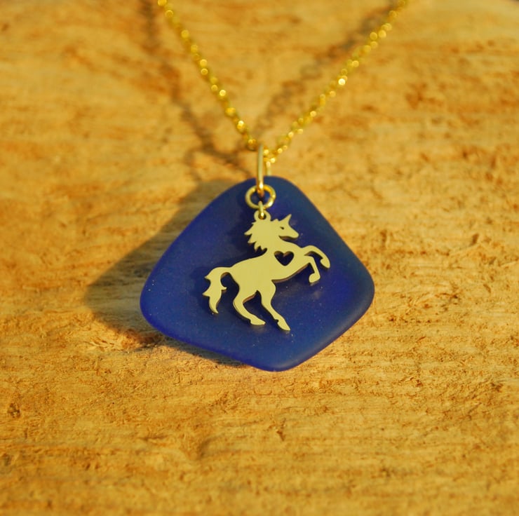 This piece of beautiful blue beach glass was a rare find. We found it on an estuary beach, and it has come from an old medicine or poison bottle. We've tumbled the pendant so it is perfectly rounded and finely frosted. The gorgeous gold plated horse charm looks fantastic against the deep blue of the glass which curves gently behind it.