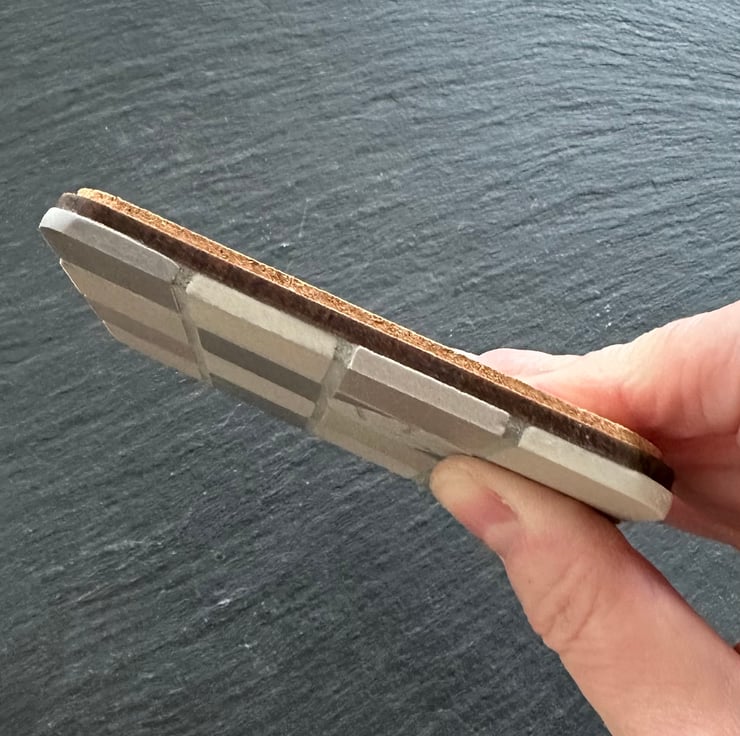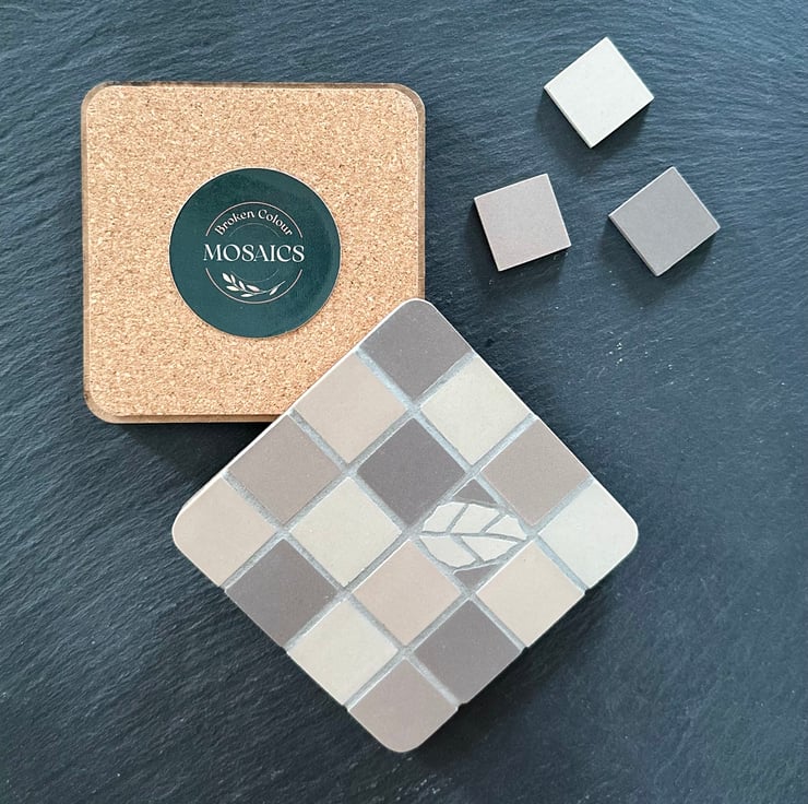 The coasters are 10cm x 10cm x 0.8cm. The mosaic is created on a wooden base and backed with cork.