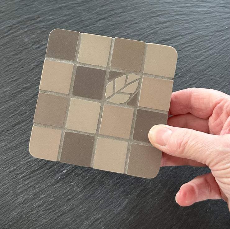 Two, rustic style, mosaic coasters in a random chequerboard design with a single, hand cut leaf motif. Created in a brown palette with beige and cream unglazed, Cinca tiles. These coasters are completed in grey grout for a subtle cottage feel.