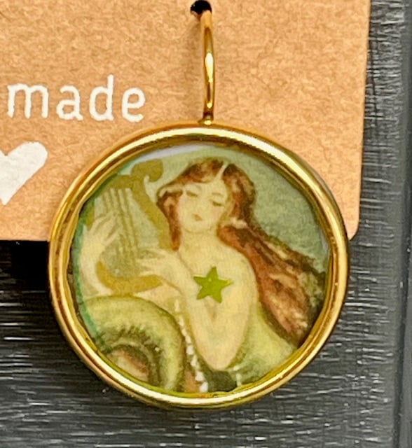 A vintage illustration of a mermaid playing a harp, framed in an 18k gold plated bezel tray and set in resin. A small gold star sequin adds colour and detail.