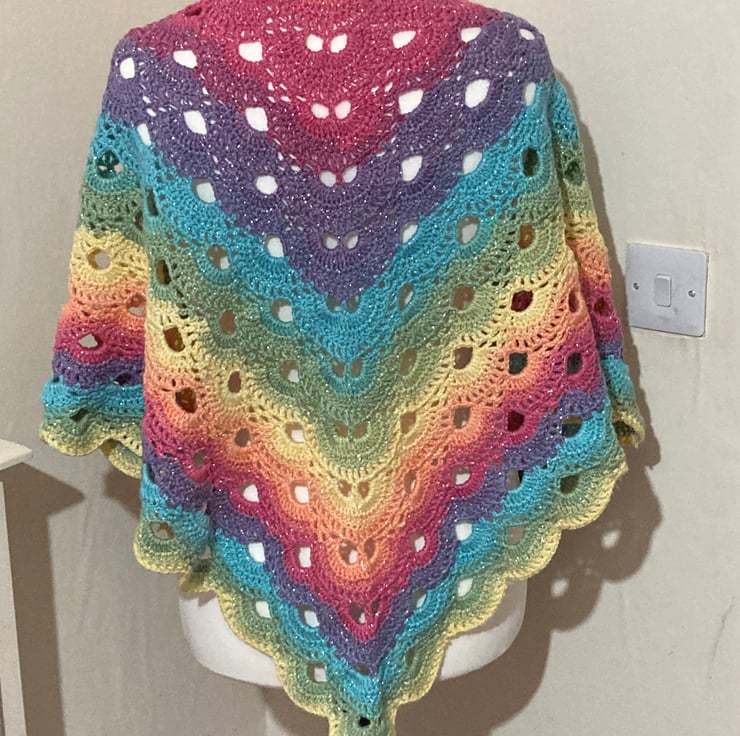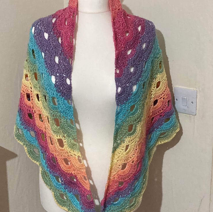 This handmade shawl is a versatile addition to any wardrobe. It’s made from premium acrylic yarn which has a slight sparkle to to yarn, which unfortunately the camera doesn’t pick up to well. It’s a perfect accessory for any season.