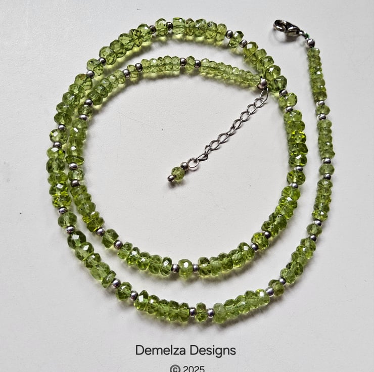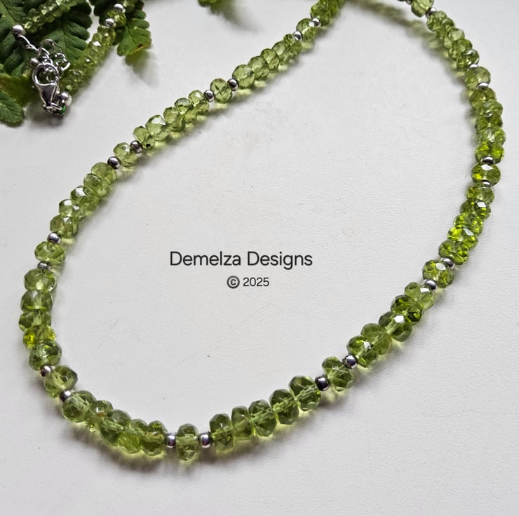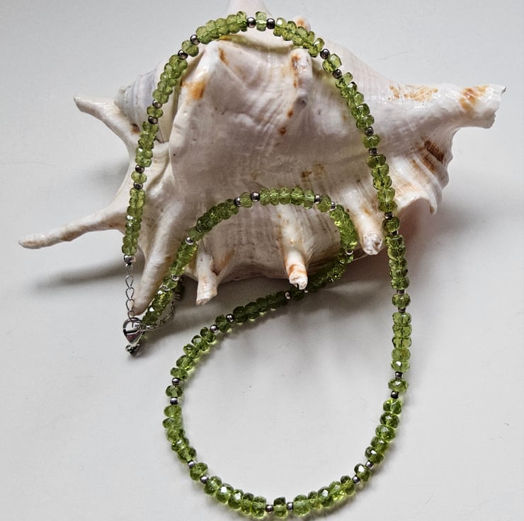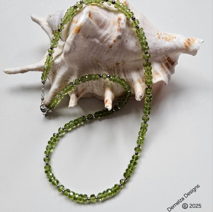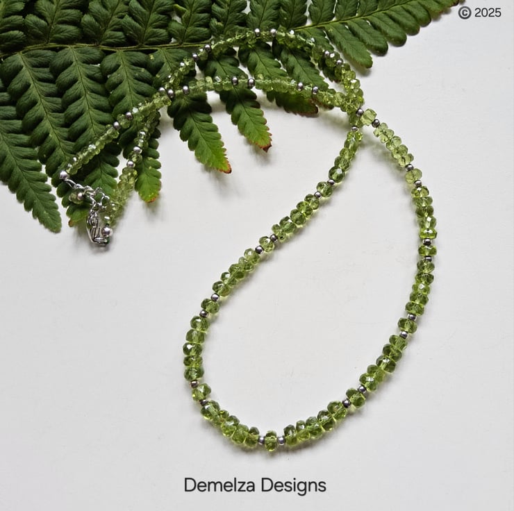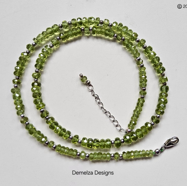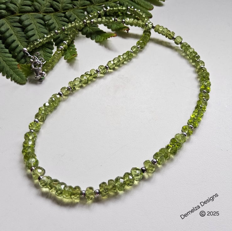 This gorgeous AA Heibi peridot necklace has been hand crafted and designed in Cornwall using faceted rondelle cuts which graduate in size from front to back. Peridot is the birthstone for August.