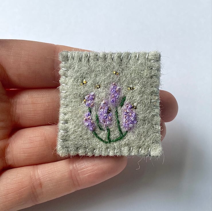 One of a kind textile brooch depicting a lovely lilac bush needle felted and embroidered over with French knots in a mix of lilacs with seven busy bees buzzing around them on a light grey wool felt background. The embroidered felt work has been backed with thick wool felt making the brooch satisfyingly sturdy. It has a standard metal brooch back securely attached to the back.