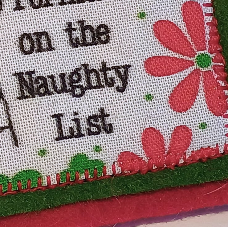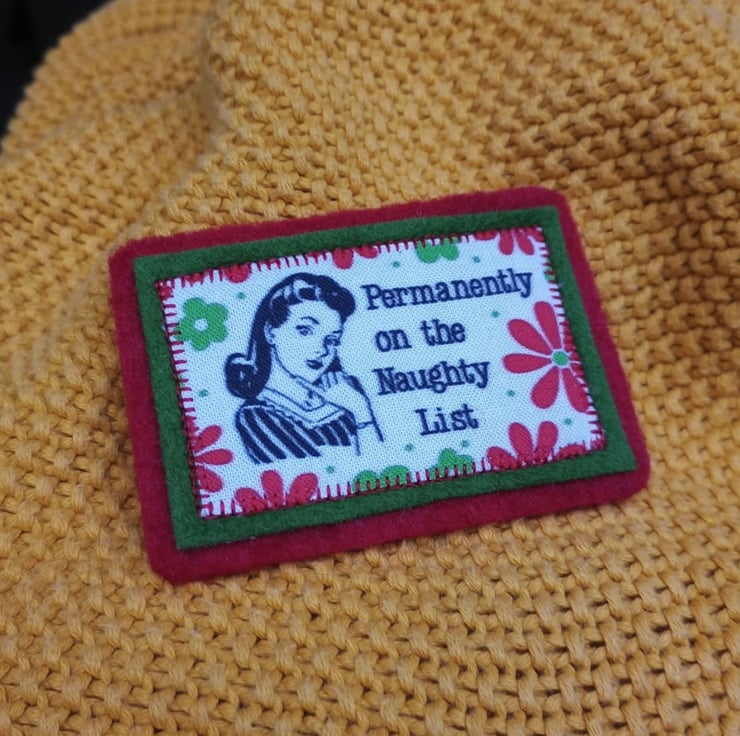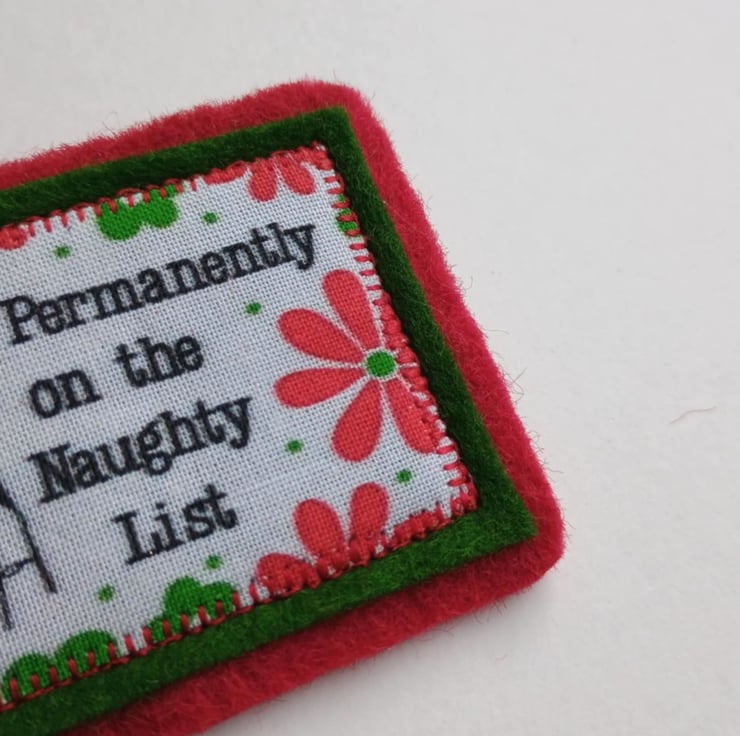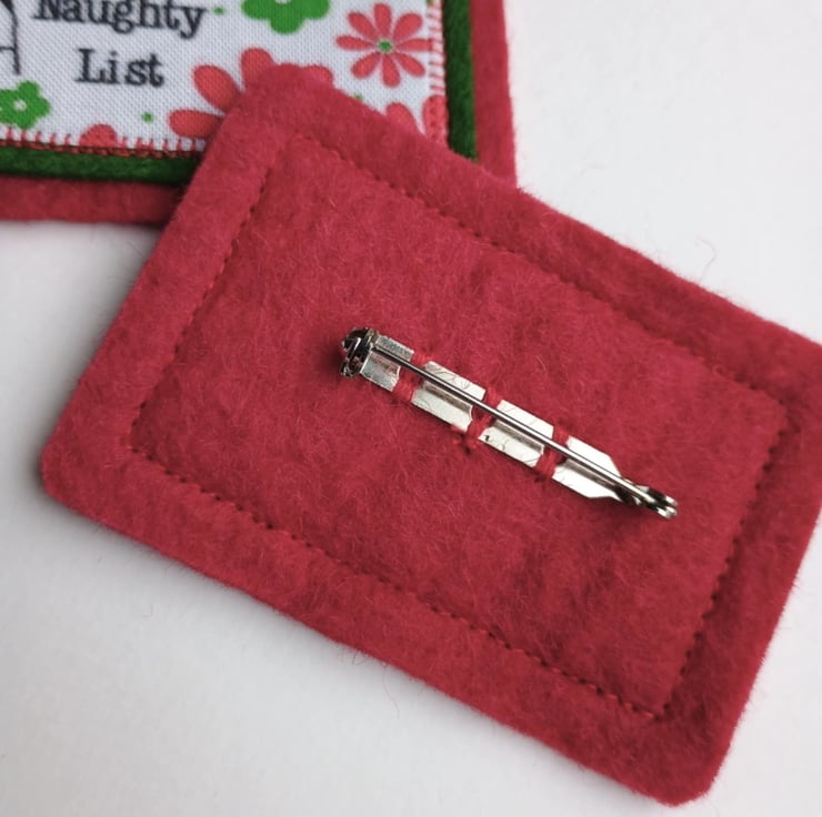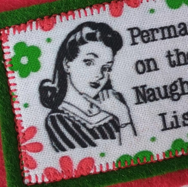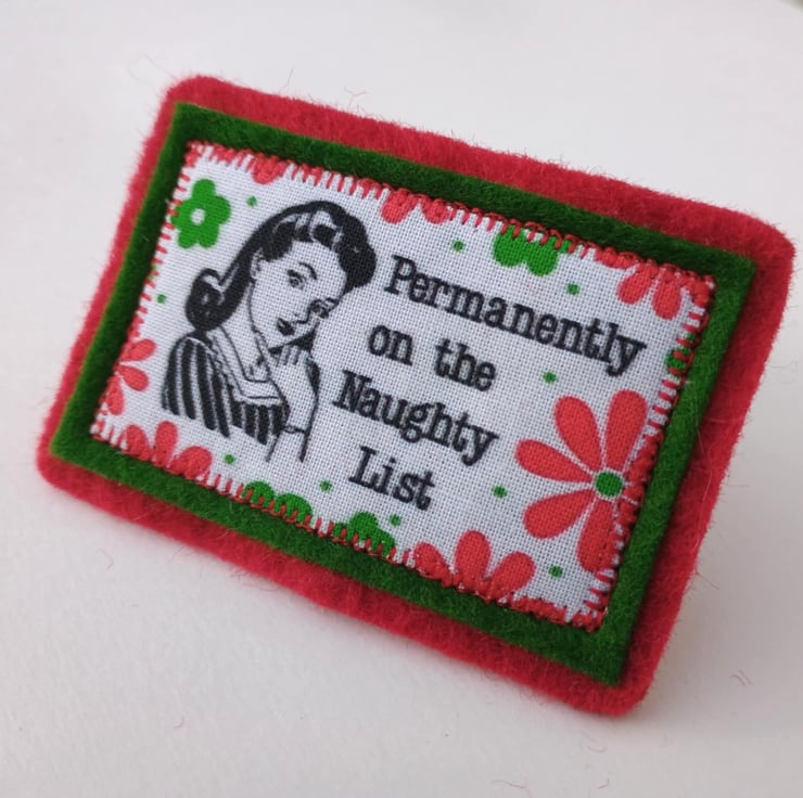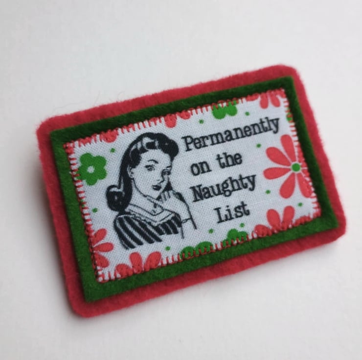 Amusing Christmas brooch, featuring a retro styled woman who is permanently on the naughty list. Made with a scrap of vintage fabric, appliqued onto green and red wool felt, this fun brooch would be a fabulous Secret Santa gift or stocking filler. Or if the shoe fits, why not buy it for yourself!
