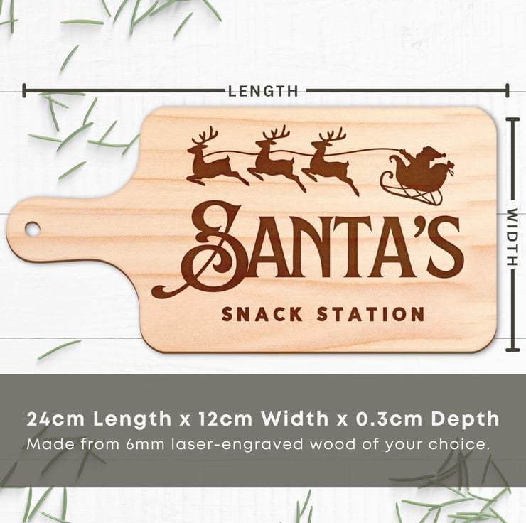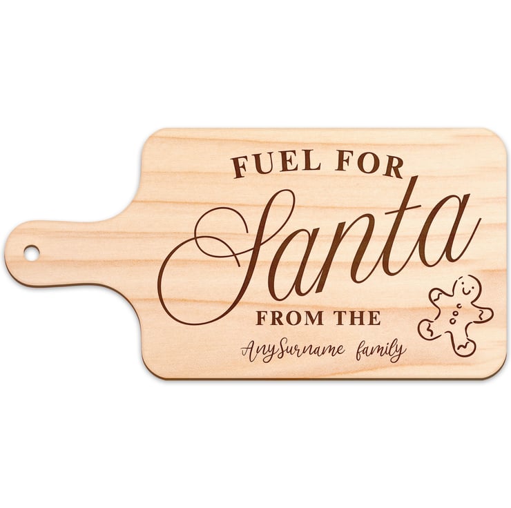 Start a beloved family tradition with this Fuel for Santa personalised treat board. Featuring elegant engraved script and a gingerbread illustration, this board can be customised with your family surname (up to 12 characters). Perfect for Santa’s milk, cookies, and Rudolph’s carrot, this 6mm laser-engraved wooden tray is a beautiful reusable keepsake for years to come.