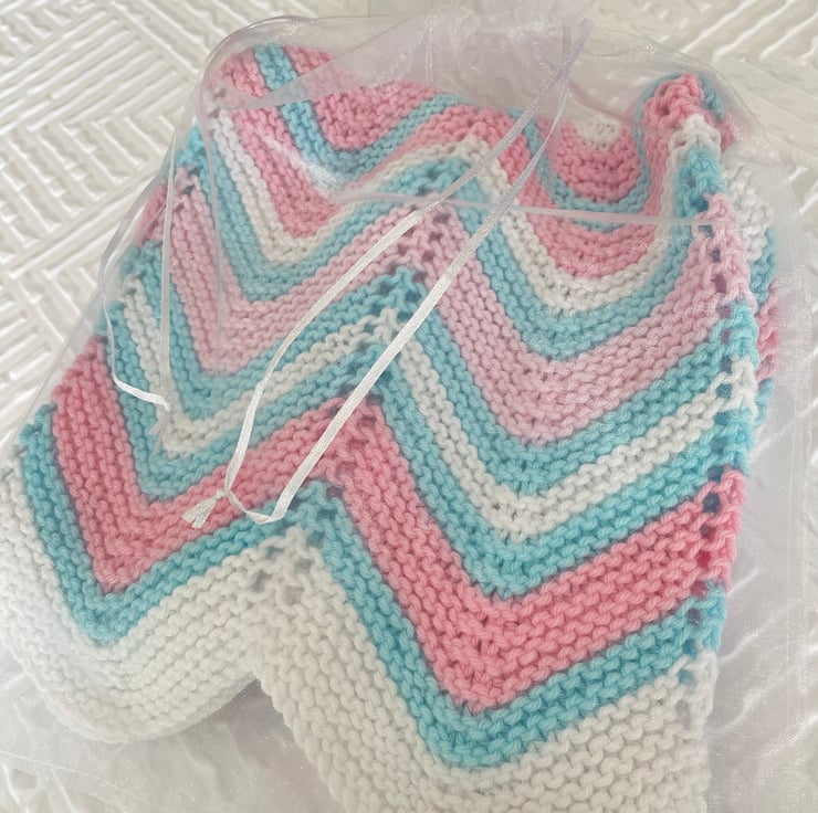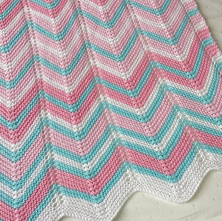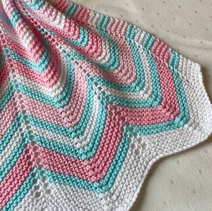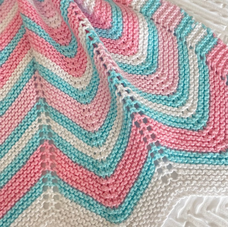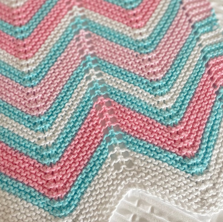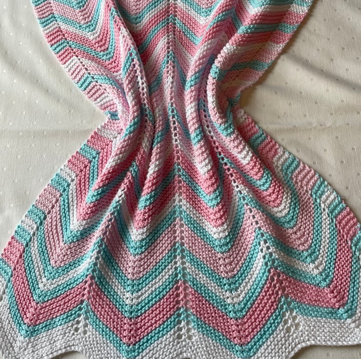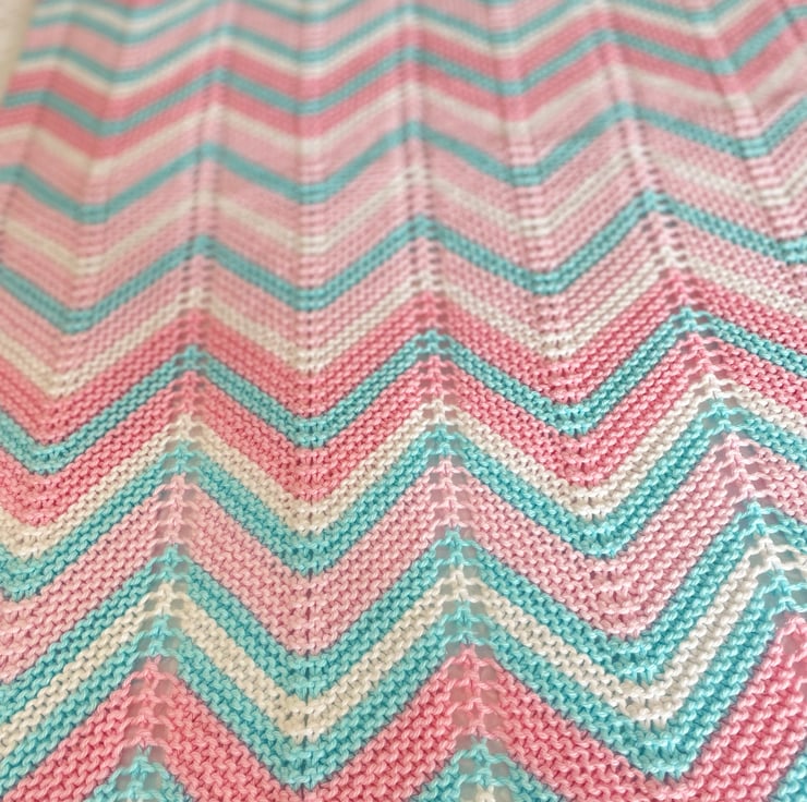 Pretty chevron striped baby blanket in stunning colours, white, pink and turquoise.