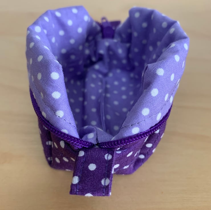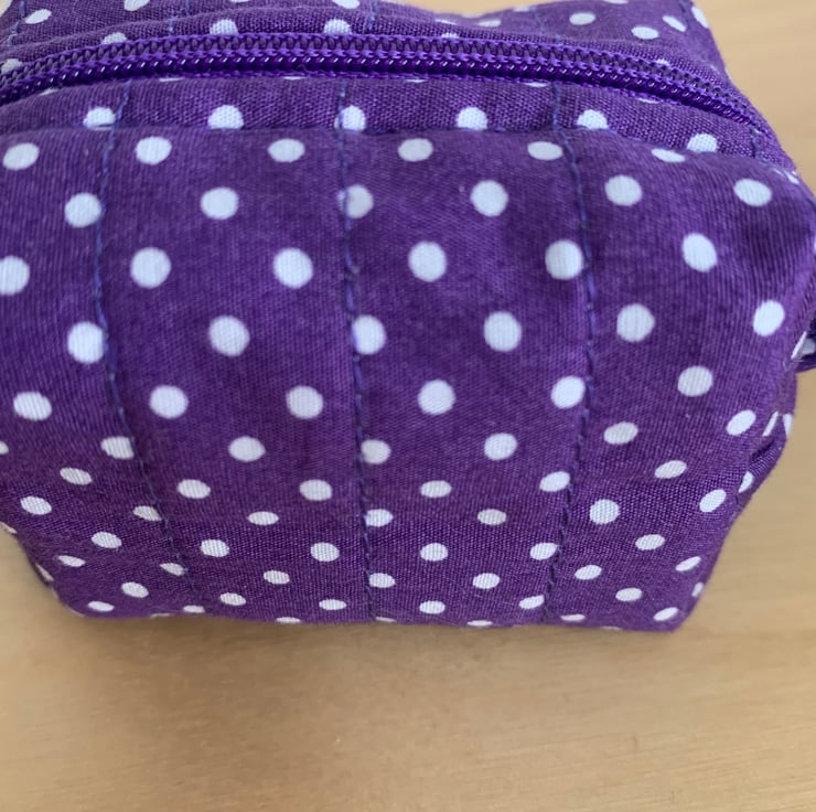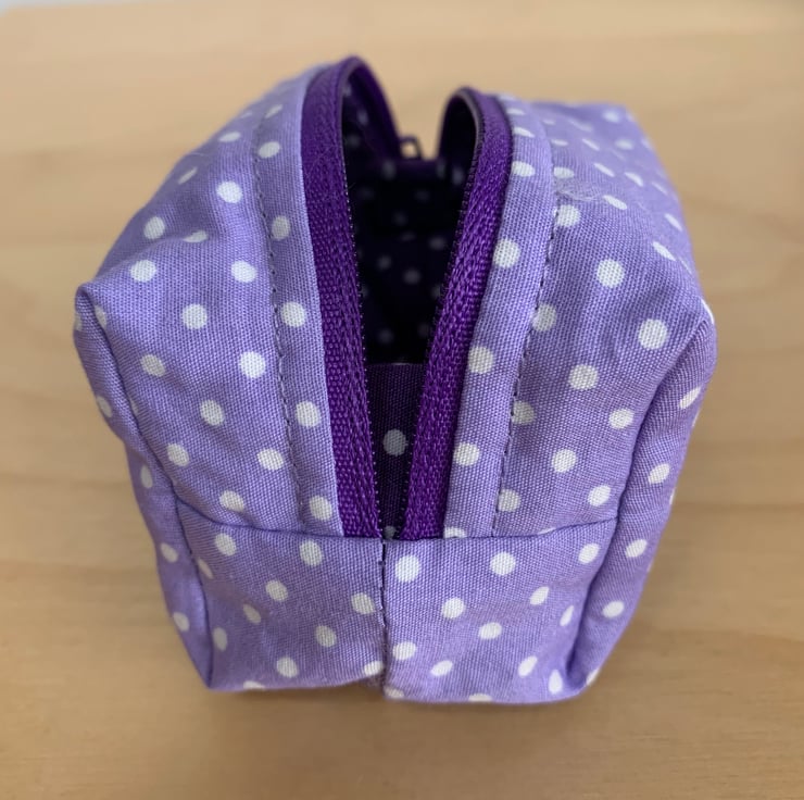 The mini box shape bag fits in the palm of your hand! It is made from this lovely purple polka dot cotton print fabric and has a lilac polka dot cotton lining with a purple zip.