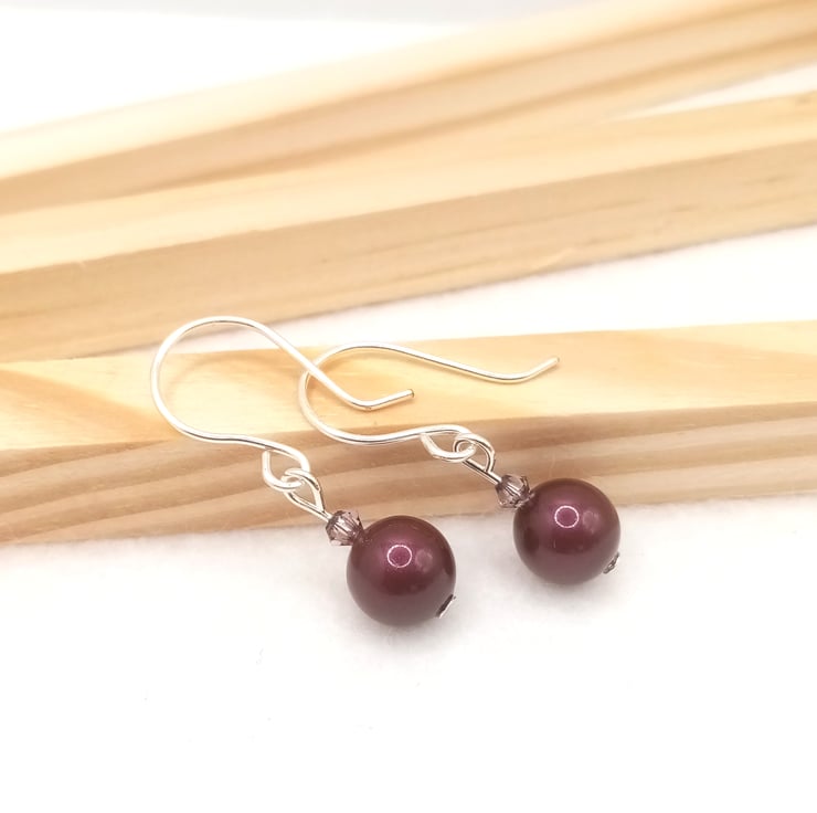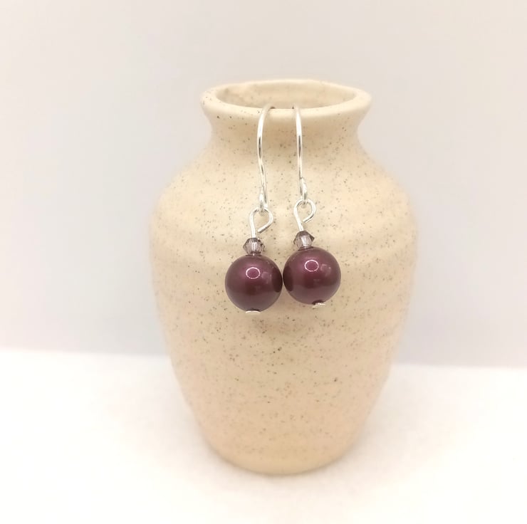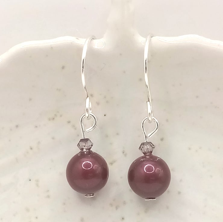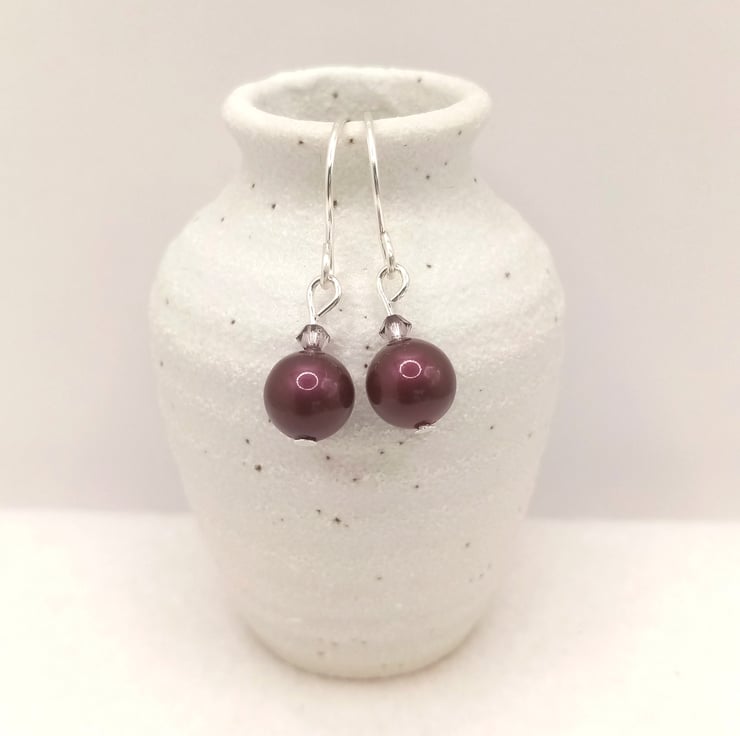 Swarovski crystal elements pearl drop earrings in blackberry-deep purple-purple jam colour.