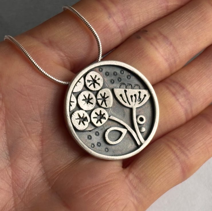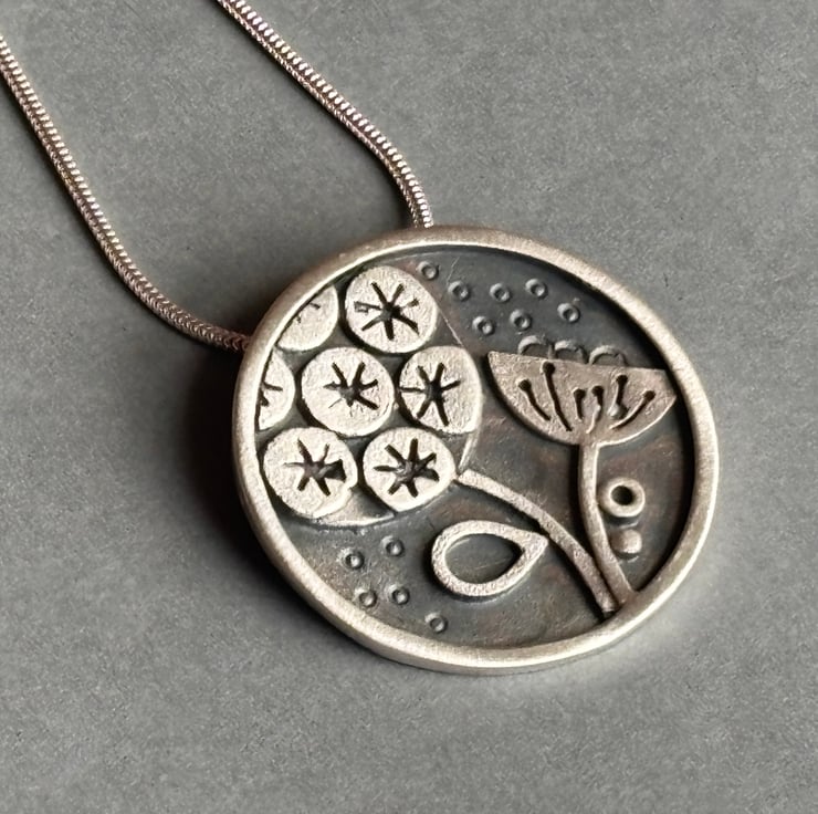 This striking necklace has been developed from my sketches of seed heads. The left seed head is based on a star scabiosa and the right on a lotus seed head. The background is textures with little circles. The pendant has then been oxidised to bring out the design and the highest surfaces are polished to a matt finish. This would make a fabulous gift for someone looking for something special and unique.