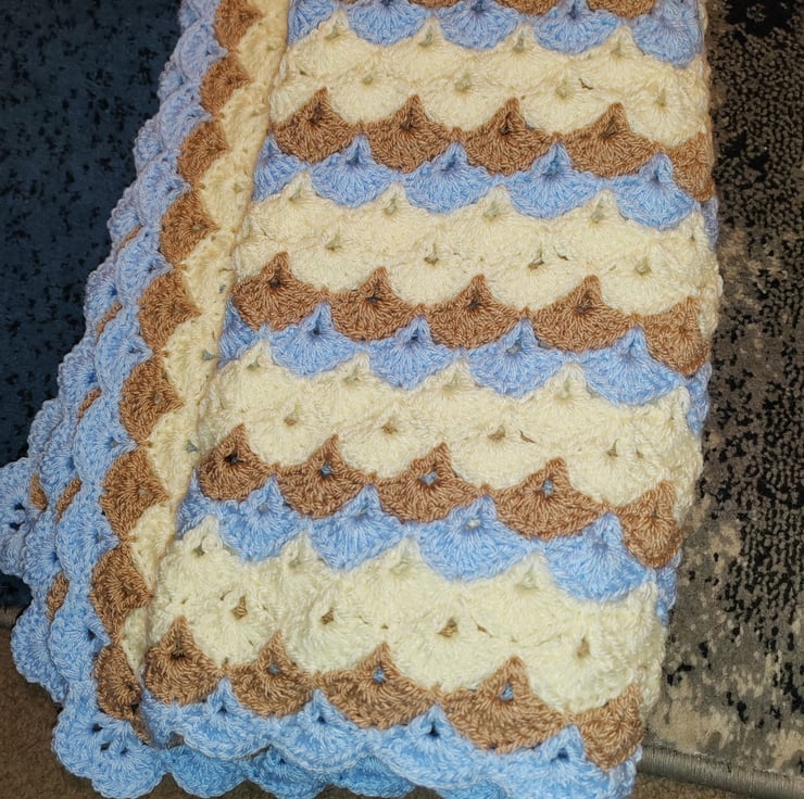 Stunning baby boy blanket in blues, brown and cream. Perfect addition to any nursery.