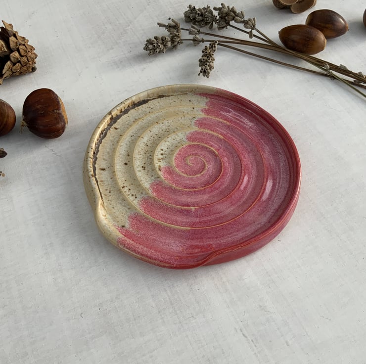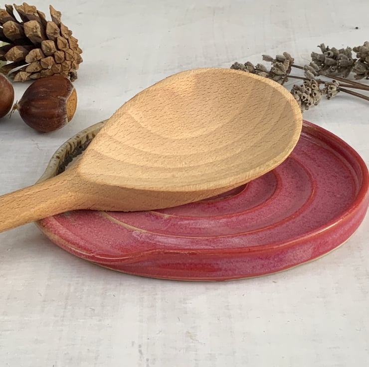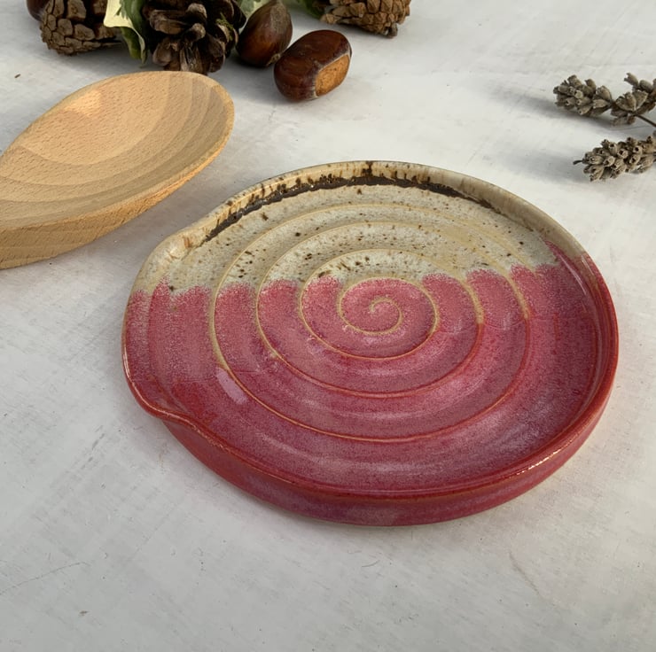 Keep your kitchen counters clean in handcrafted style with this stoneware spoon rest, lovingly hand-thrown on the wheel. Finished in Winter Wood and raspberry mist glazes, each piece features a unique spiral pattern that reflects the maker’s touch. The lowered lip cradles your spoon perfectly, combining beauty with everyday practicality. Durable, tactile, and made to last — a charming companion for any cook who loves handmade pottery and timeless design.