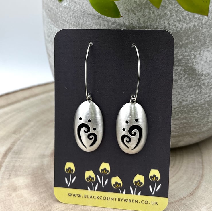 These sterling silver oval earrings are a stunning bold domed oval with delicate pierced detail inspired by the magnificent unfurling ferns in Spring. They are given a beautiful brushed matt finish and they hang from sterling silver hook wires. A stunning addition to an outfit for a special occasion. These earrings have been hallmarked at the Birmingham Assay Office.