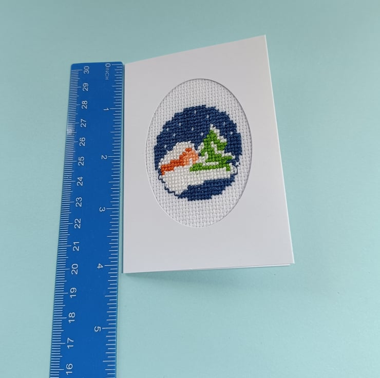 Lovingly stitched with high-quality threads on white aida fabric, this small card captures the cosy magic of a quiet winter night.
