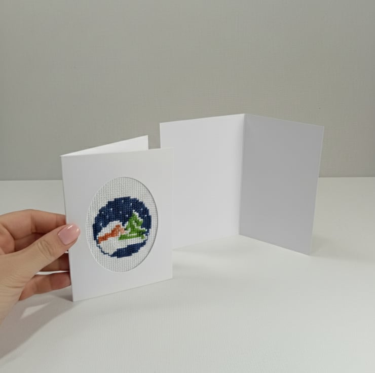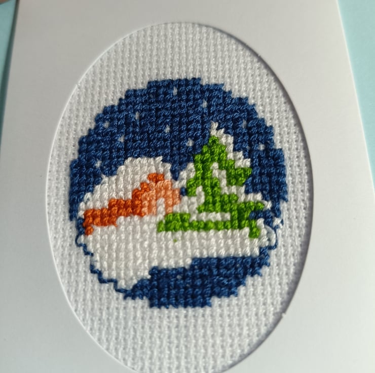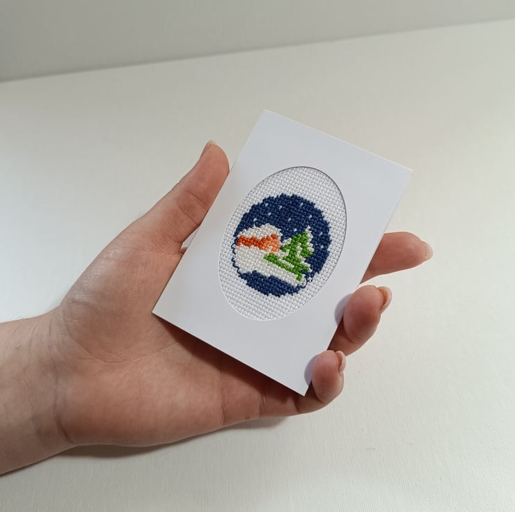 This handmade Christmas card features a charming cross stitch design of a tiny snowy cottage and Christmas tree under a dark winter sky.