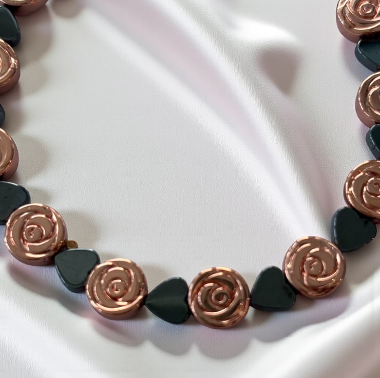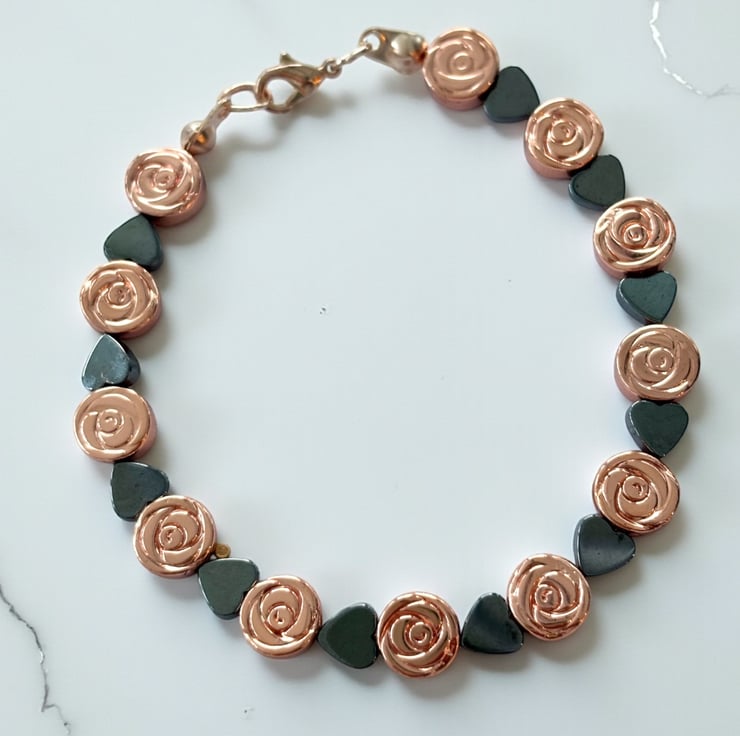 This bracelet has been handmade using 6mm Rose Gold plated Hematite Rose Discs and natural Hematite love hearts, fastened with a lobster clasp it is made to fit a 7” wrist, I can custom make to fit smaller or larger wrists, please send me a message after purchase with your wrist size, this bracelet makes a perfect gift for someone you love, it will come perfectly gift wrapped in pretty tissue and an organza gift bag.