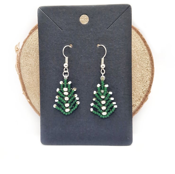 These Snowcapped green Christmas tree beaded earrings are carefully and lovingly stitched and created with high quality faux sea glass green seed beads and white shimmering seed beads and silver plated ear wires.