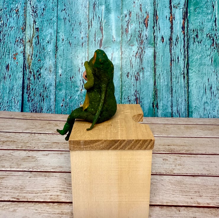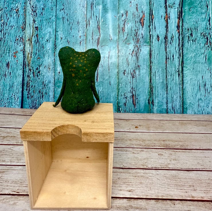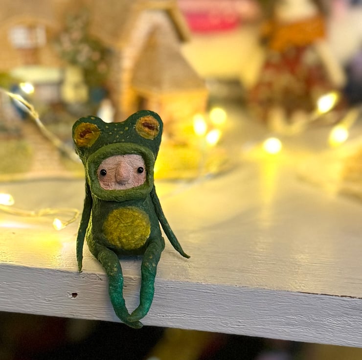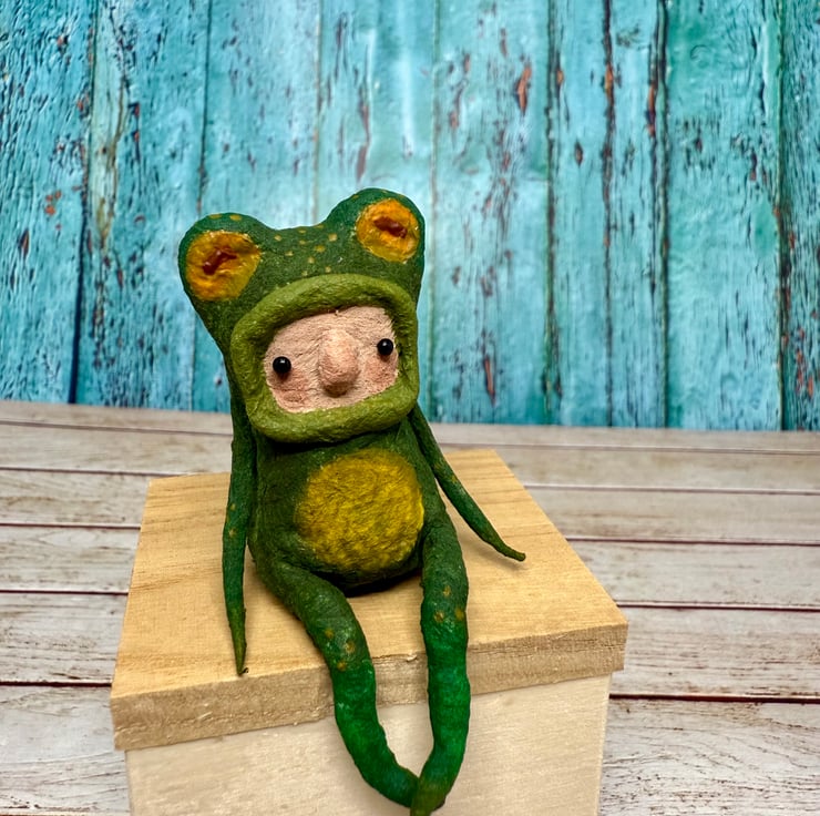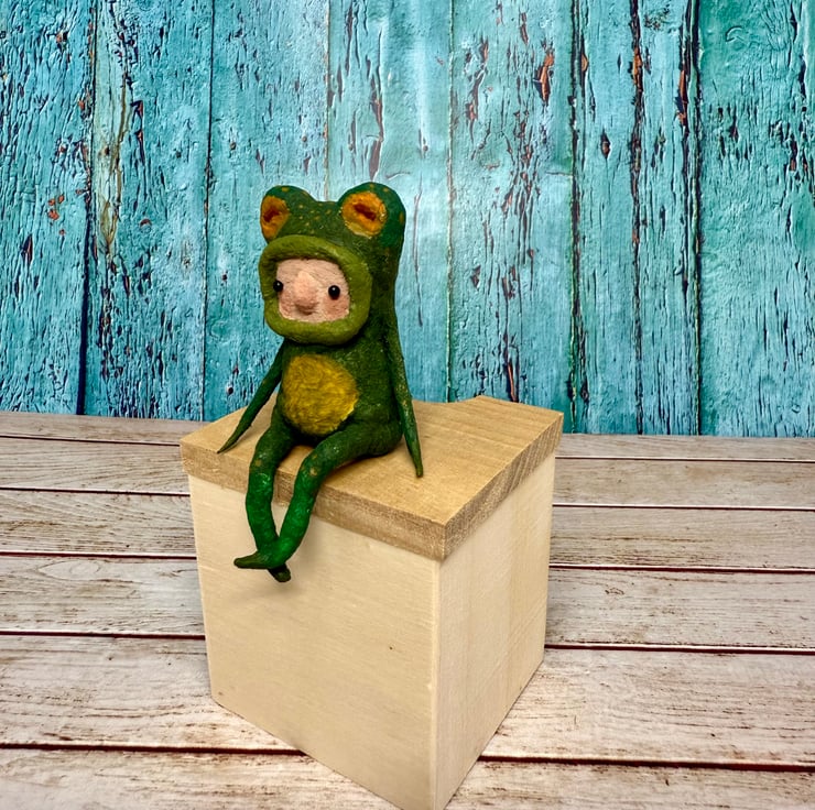 This little character sits peacefully atop a frame or on a shelf to keep you company. Made from spun cotton and completely hand painted, each one is unique. Frog has glass bead eyes and is decorated with speckles and big yellow frog eyes. Measures roughly 7cm tall and comes in recyclable or recycled packaging.