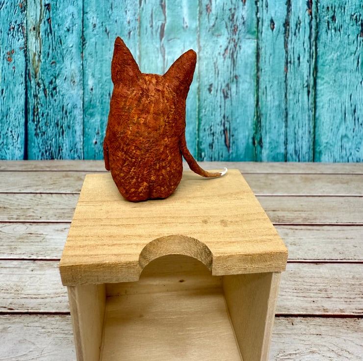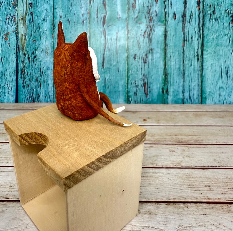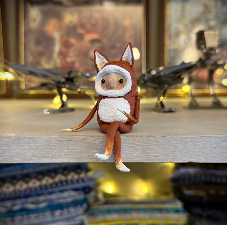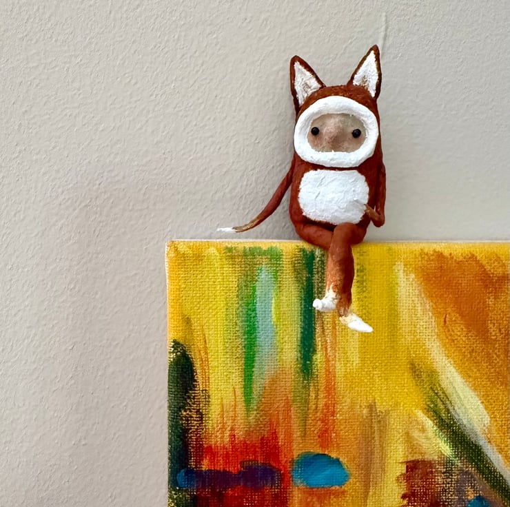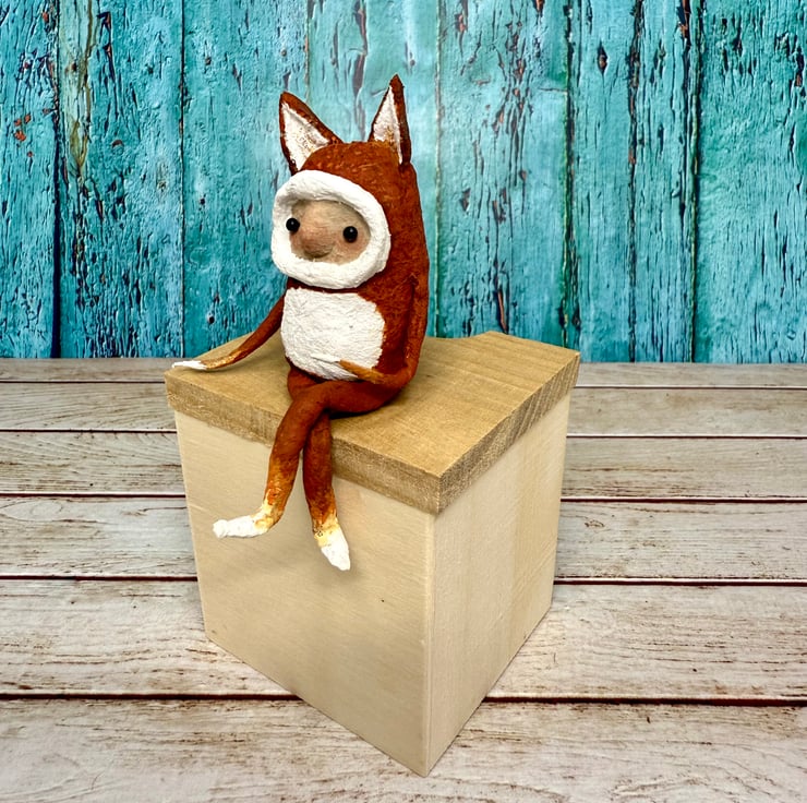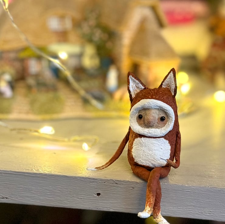 This little character sits peacefully atop a frame or on a shelf to keep you company. Made from spun cotton and completely hand painted, each one is unique. Fox has glass bead eyes and is decorated with orange flecks and white tips. Measures roughly 7cm tall and comes in recyclable or recycled packaging.