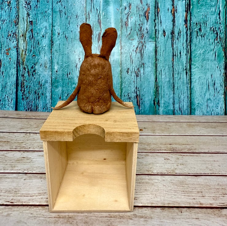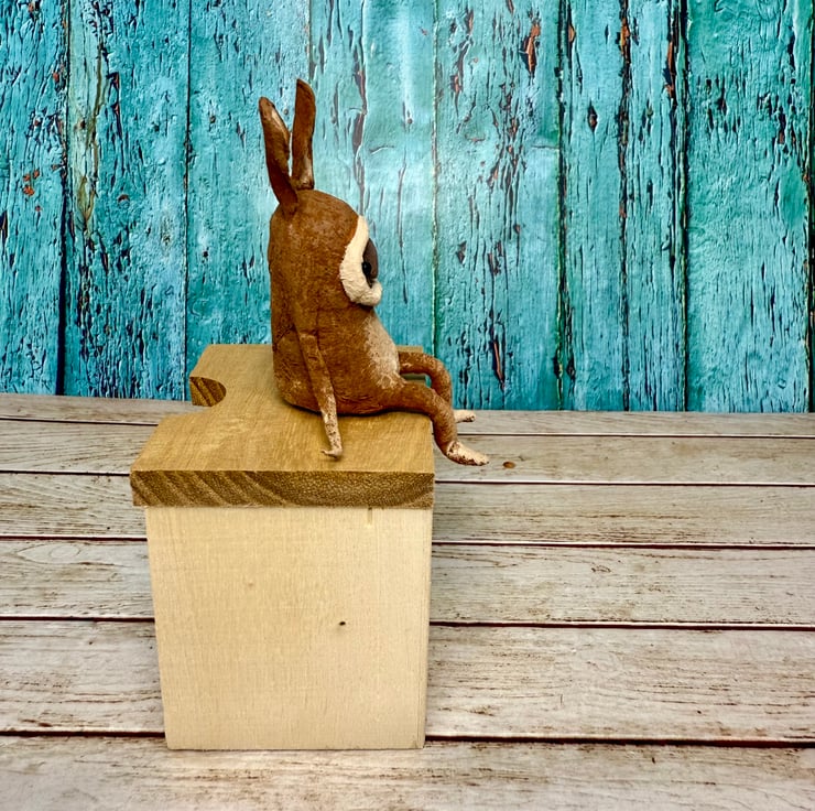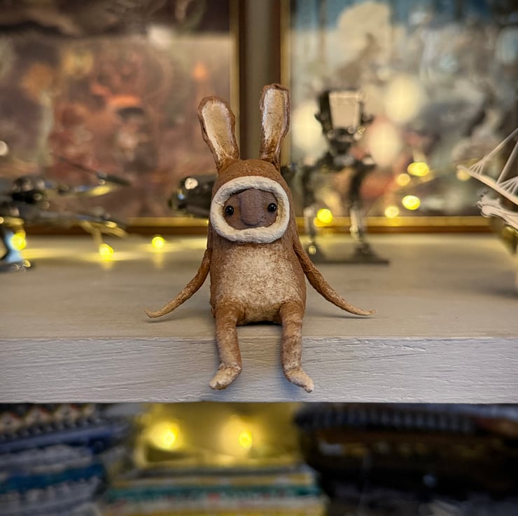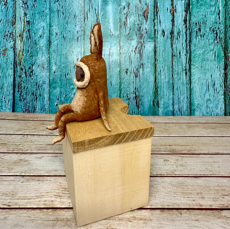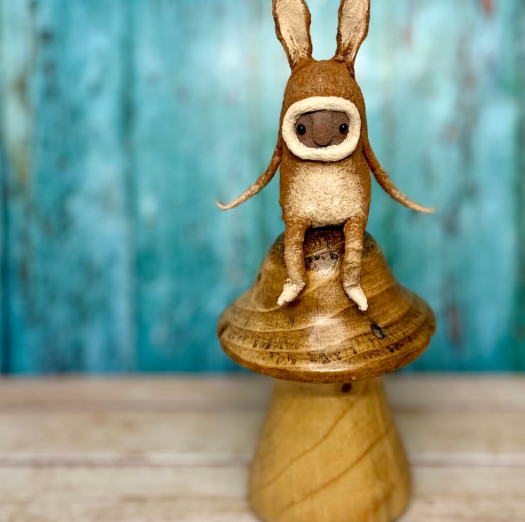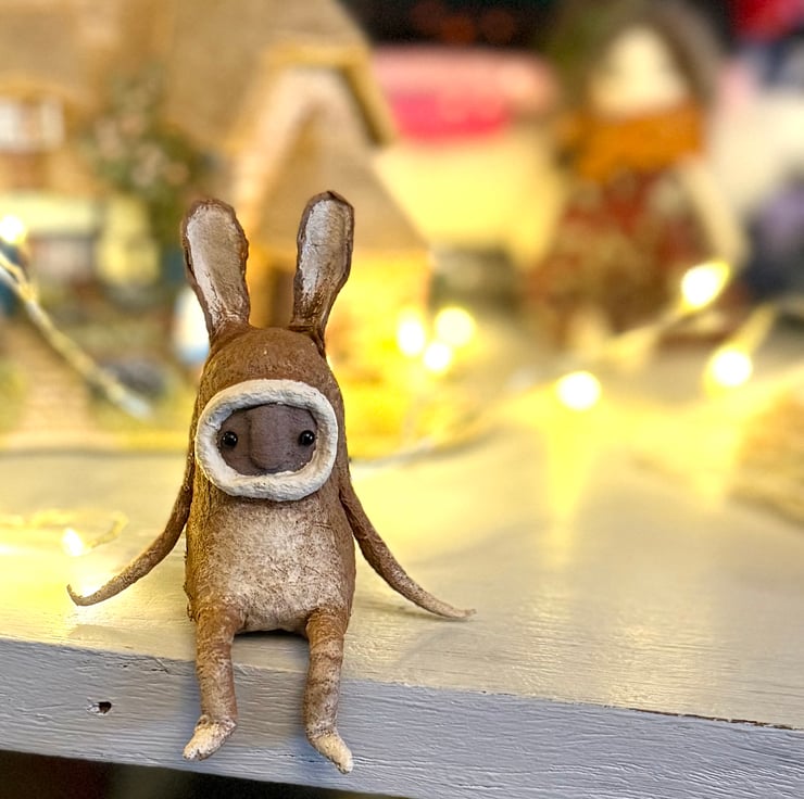 This little character sits peacefully atop a frame or on a shelf to keep you company. Made from spun cotton and completely hand painted, each one is unique. Hare has glass bead eyes and is decorated light tummy and feet and long ears. Measures roughly 7cm tall and comes in recyclable or recycled packaging.