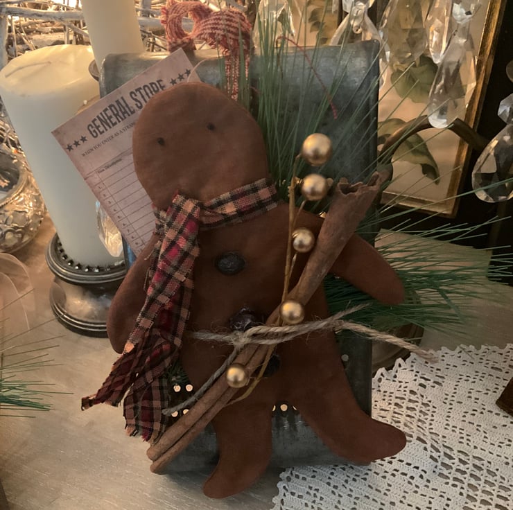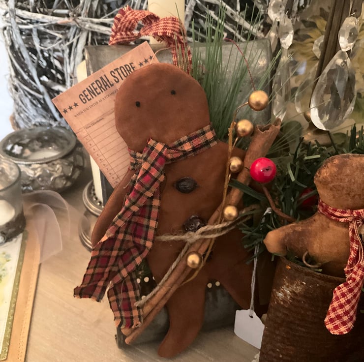 It comprises of a cute handmade primitive gingerbread man, decoratively displayed on a vintage, rustic grater. The gingerbread man has dried rosehip buttons and a homespun tie.
