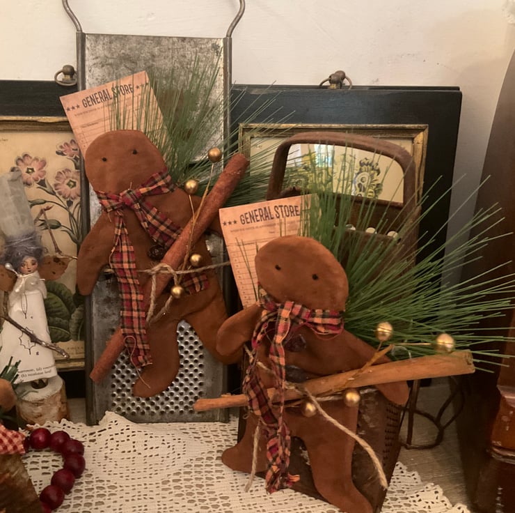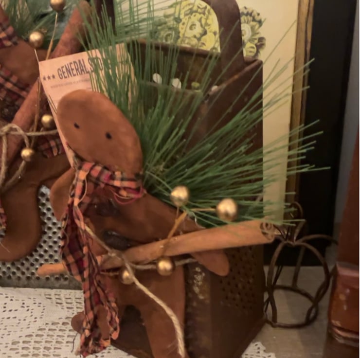 It comprises of a cute handmade primitive gingerbread man, decoratively displayed on a vintage, rustic grater. The gingerbread man has dried rosehip buttons and a homespun tie.