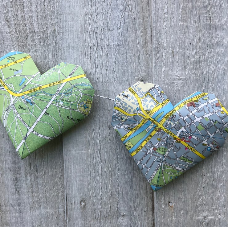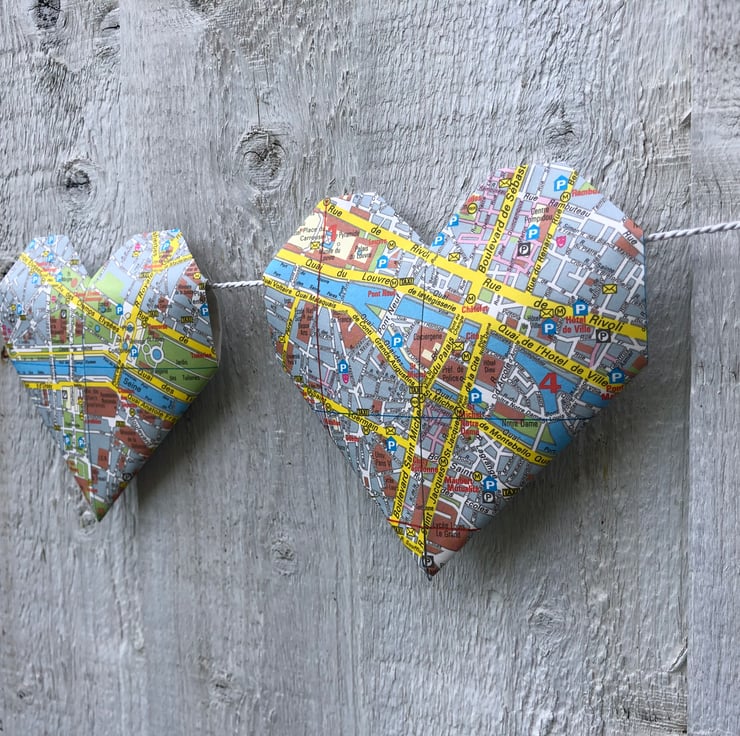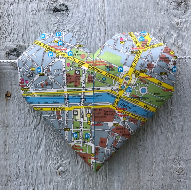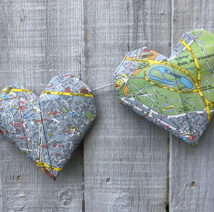 11 paper Origami lovehearts handmade and repurposed from a 1991/92 edition of a Paris city map. Each loveheart measures 12cm (width). The lovehearts are strung on a silver/grey cord and the overall hanging length of the garland is 150cm with additional length for hanging and fastening. This unique garland is supplied with a Paris gift tag and would make an ideal gift or decoration for a lover of Paris or for anyone planning a surprise trip. Many of the iconic landmarks of Paris are featured. Indoor use only.