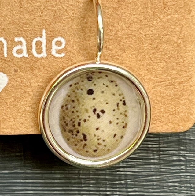 A vintage illustration of a little speckled egg, framed in an silver plated bezel tray and set in resin.