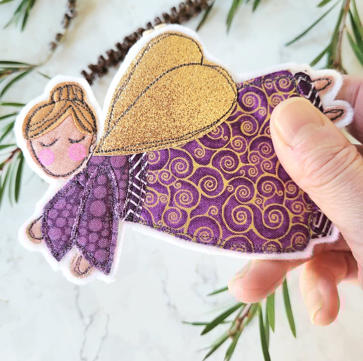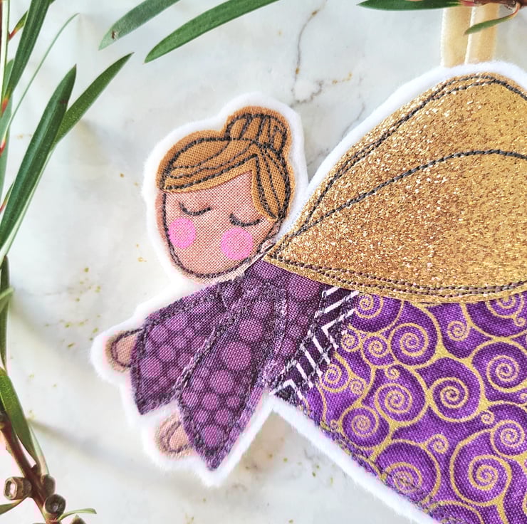 Handmade Christmas Fairy tree ornament with gold glittery wings. Created using freemotion sewn raw edge fabric appliqued onto a felt backing finished with a velvet ribbon hanging ribbon.
