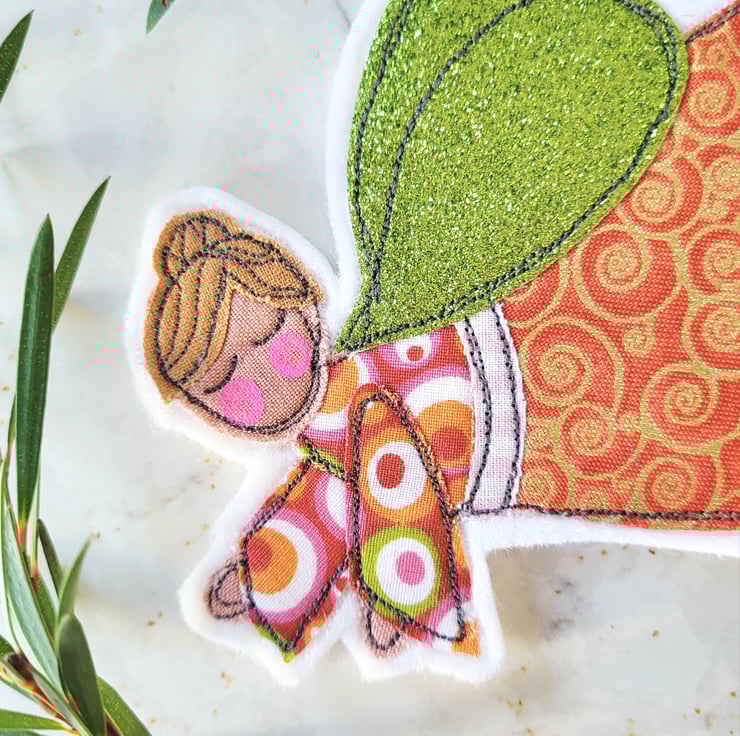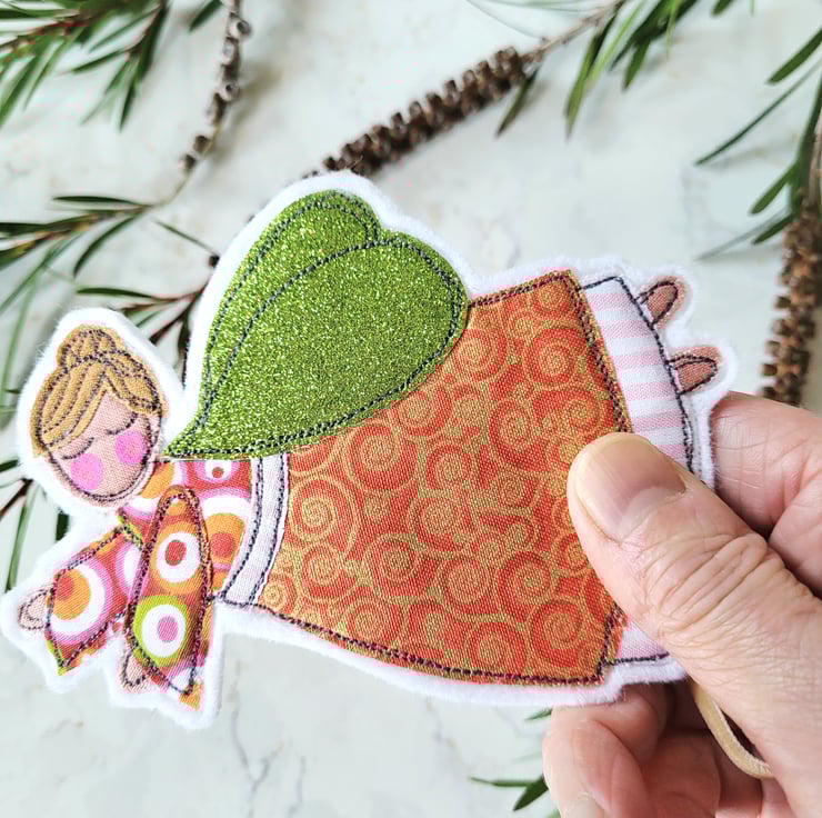 Handmade Christmas Fairy tree ornament with green glittery wings. Created using freemotion sewn raw edge fabric appliqued onto a felt backing finished with a velvet ribbon hanging ribbon.