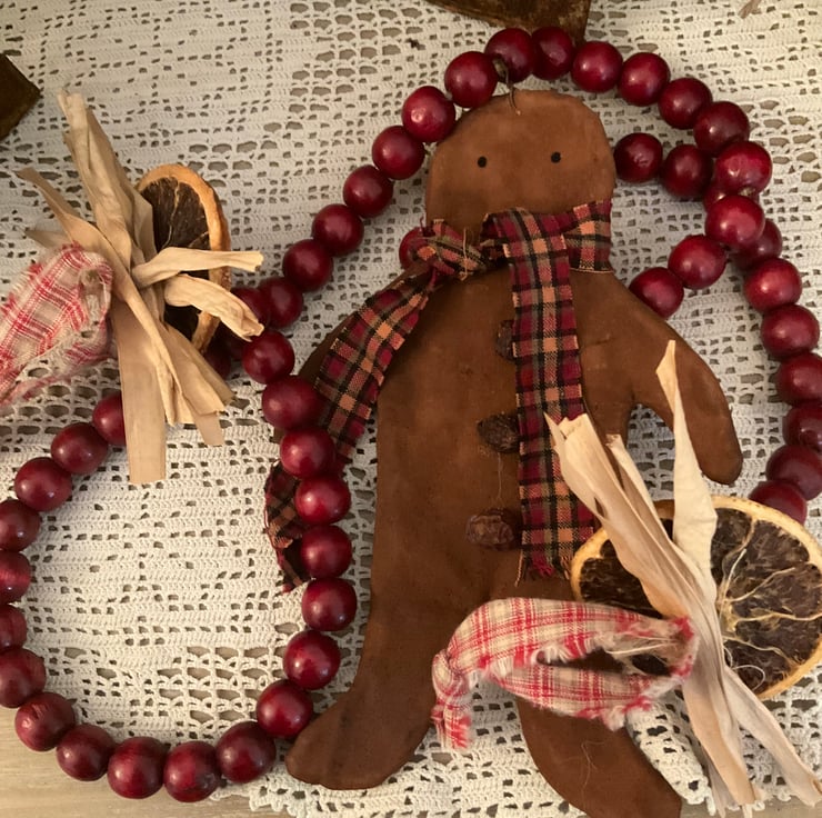 It features a handmade primitive gingerbread man, along with dark red wooden beads, and threaded at the ends with a dried orange slice, corn husks and a homespun fabric loop to hang the garland from.