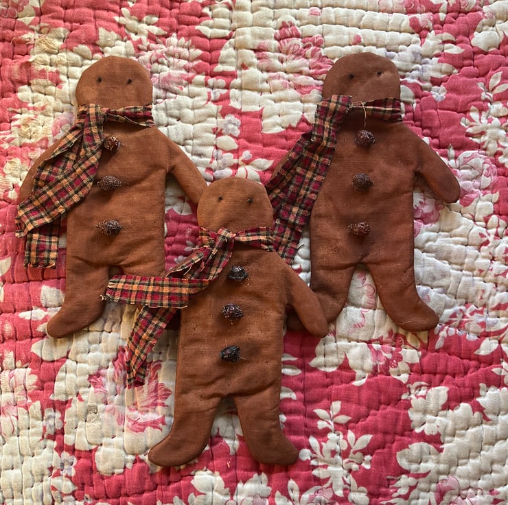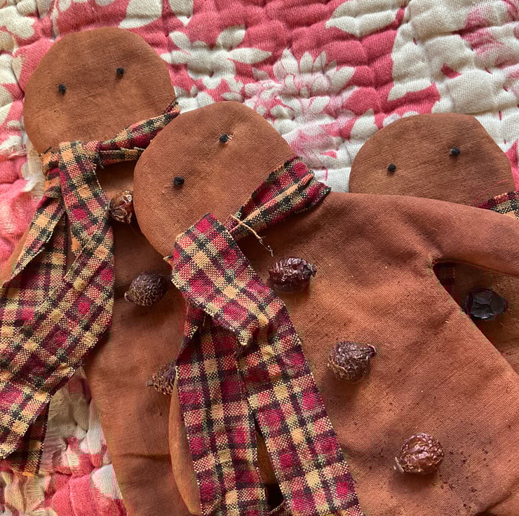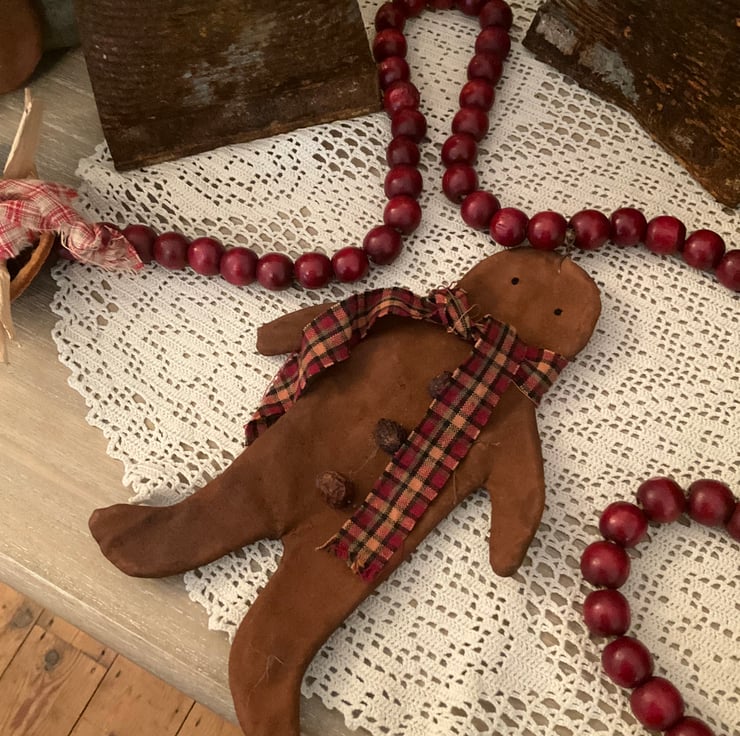 The gingerbread man has dried rosehip buttons, French knot eyes, and a homespun tie.