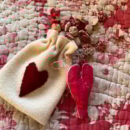 A primitive gingerbread man, tucked into a rusty, rustic tin, along with some greenery and a sprig of red berries. Finished off with a handmade stamped label - primitive gingerbread. Hangs from a piece of rusty tin wire at the back. The gingerbread man is finished off with a homespun tie and rusty bell.