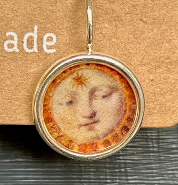 A vintage illustration of a little celestial face, framed in an silver plated bezel tray and set in resin. A little gold star sequin adds a splash of colour and detail.