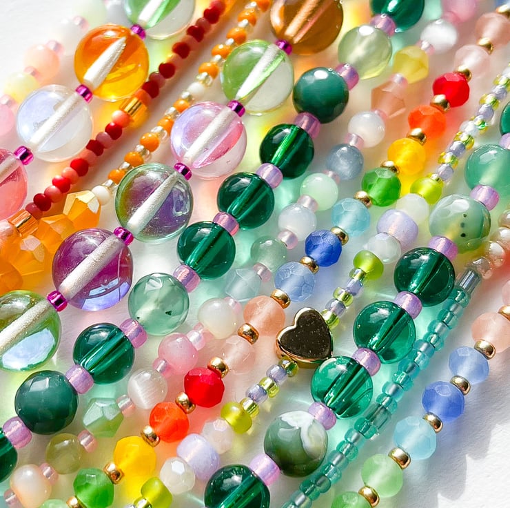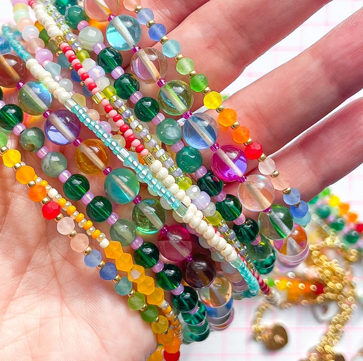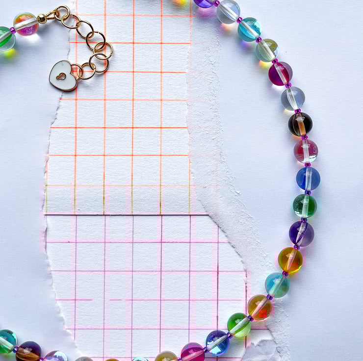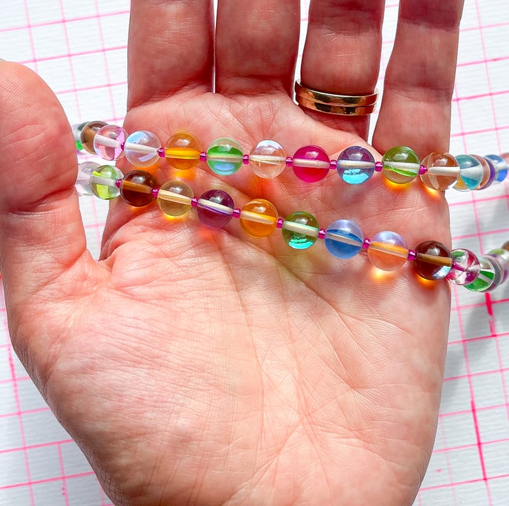 These beads instantly reminded me of bubbles catching the light, all soft rainbow sheens and shifting colours, and I knew they had to become a chunky, tactile necklace, something versatile, joyful, and a bit unusual.