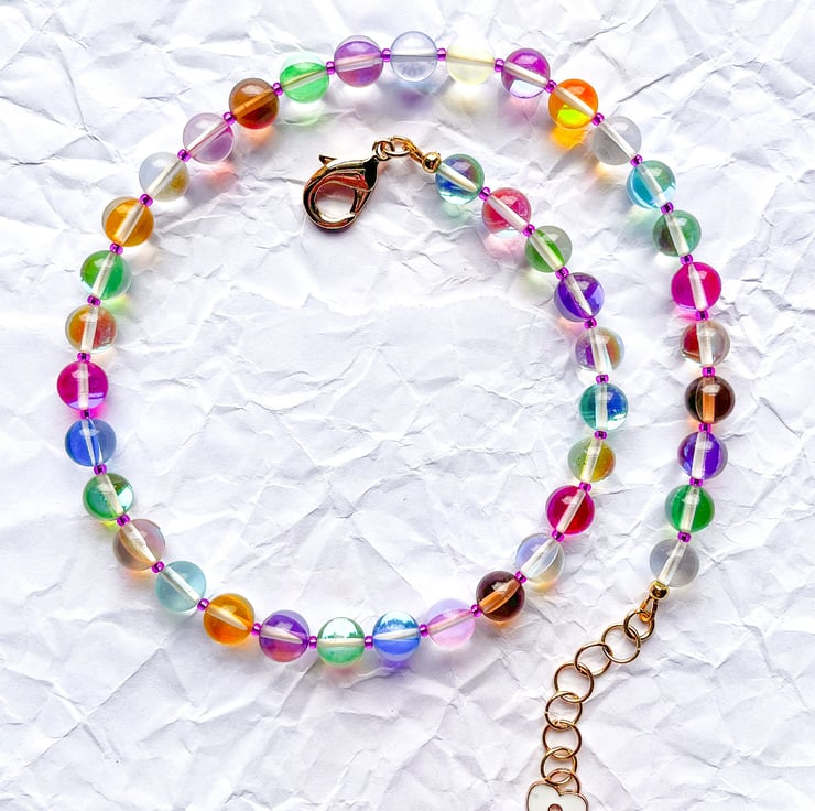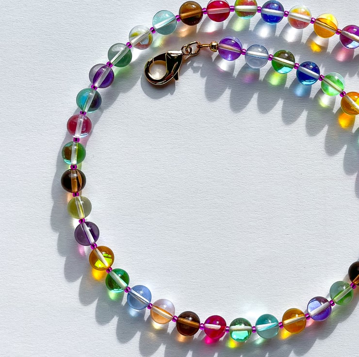 Bring a little shimmer into your everyday with this chunky iridescent glass bead necklace. The beads glow with soft rainbow colours, pinks, blues, greens, lilacs and yellows that shift beautifully in the light, just like bubbles or moonstone.