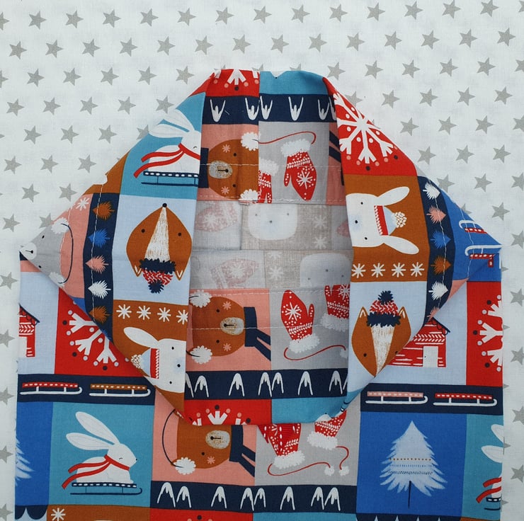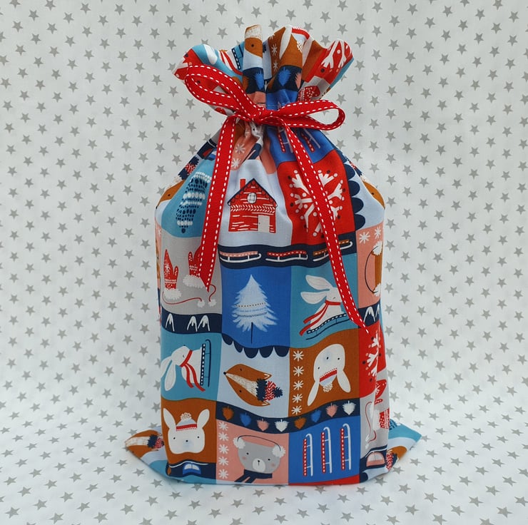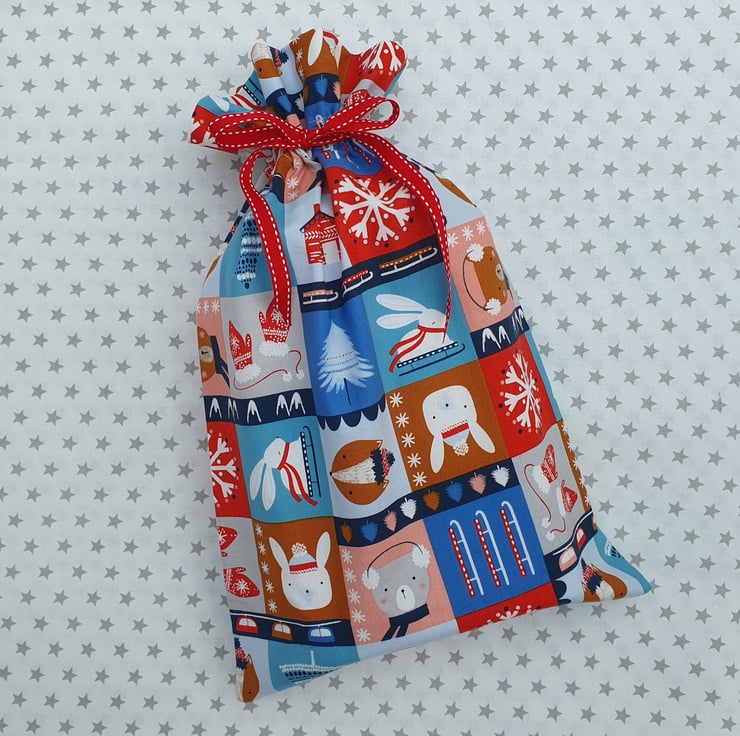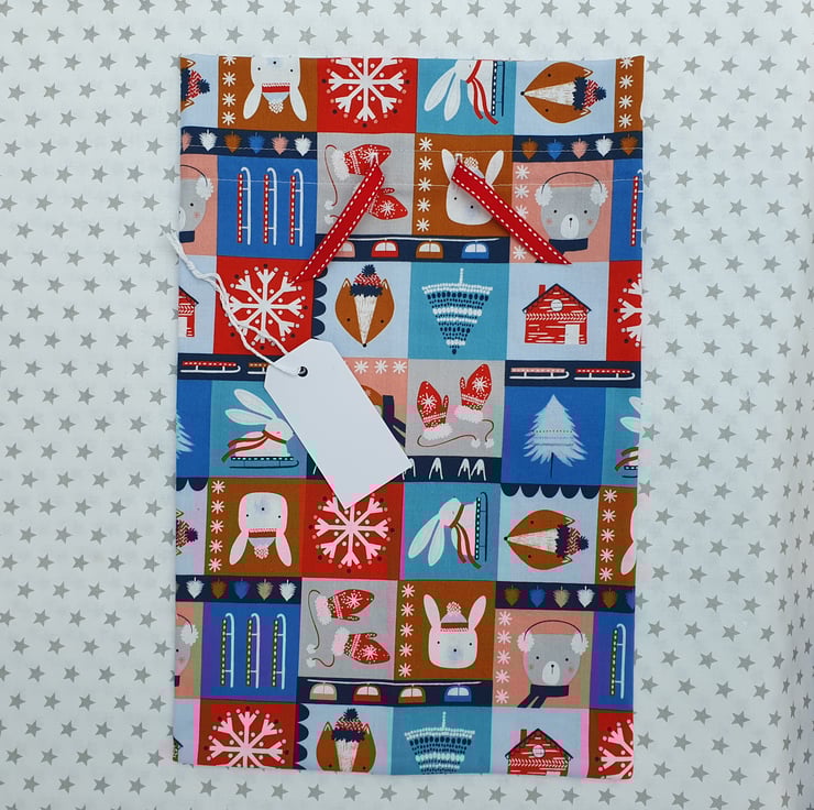 The material is Snow Much Fun Ski Blocks in cotton from Dashwood Studio featuring skis, mittens and cute animals. The look is completed with a festive, red, grosgrain, running stitch ribbon. Please note, the pattern maybe slightly differently placed, as there are multiples of this design.
